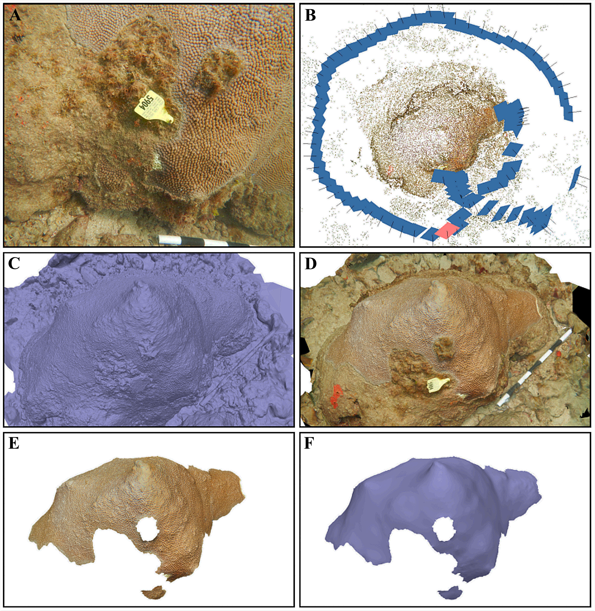 The six notable stages of our three-dimensional modeling process. (A) An example of one of the 87 overlapping images that were captured of a Montastraea cavernosa colony in the probiotic bag treatment group. (B) The sparse-point cloud with the estimated position (blue rectangles) and orientation (black projection lines) of all 87 photographs from the camera-alignment process, where the pink rectangle indicates the camera position that captured the image in (A). (C) The mesh, which was produced by image-depth mapping of the sparse-point cloud, without texture and (D) with texture from the source imagery. (E) The textured mesh that was manually traced to isolate the total tissue surface area and then (F) smoothed to remove fine scale detail that inherently varies between monitoring dates, with the texture toggled off to illustrate changes relative to (C). Each white or black segment on the scale bar in (A, D) is 10 cm.
