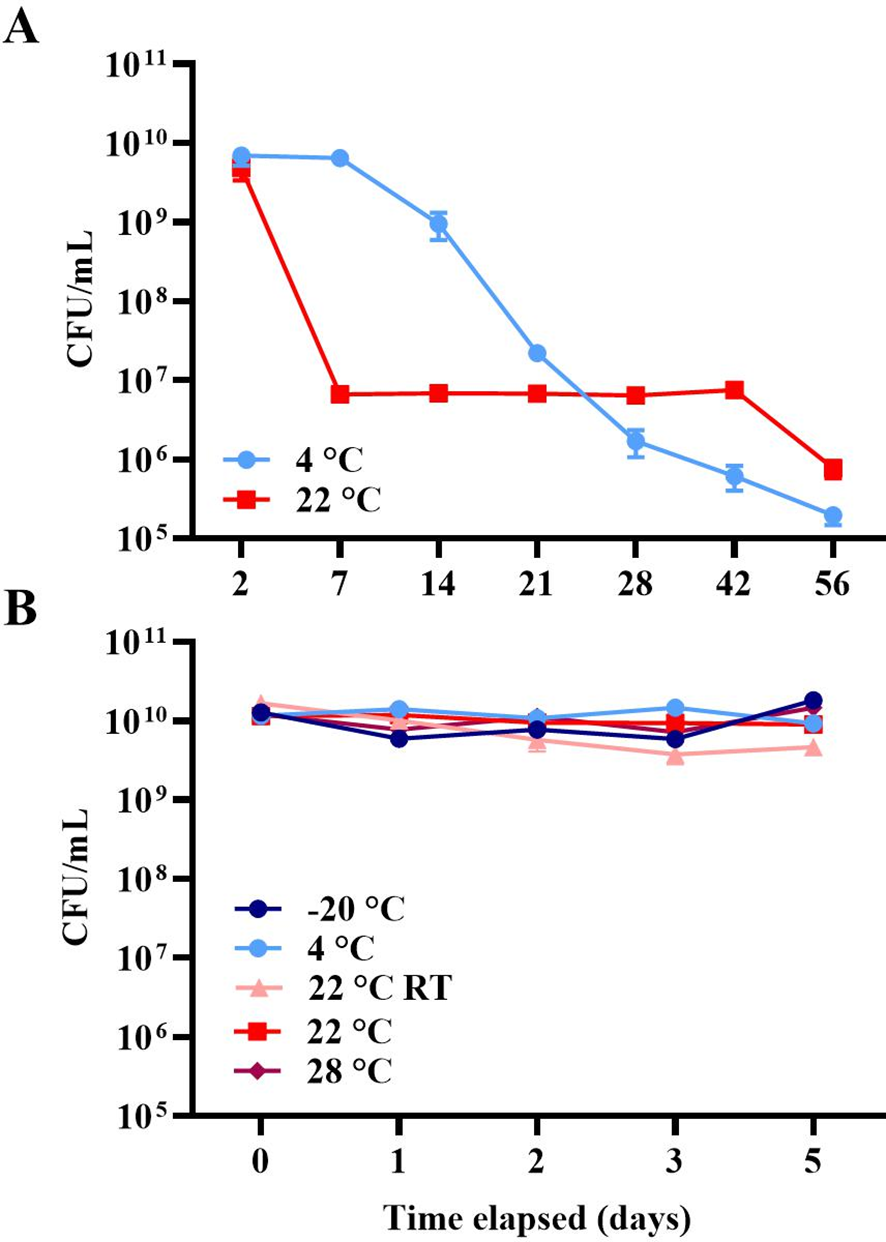 (A) Viability (as mean log CFUs per milliliter (± 1 SEM), n = 3) of McH1–7 at 4°C (light blue) or 22°C (red) over 56 days. (B) Viability (as mean log CFUs per milliliter (± 1 SEM), n = 3) of McH1–7 incubated at -20°C (navy), 4°C (light blue), 22°C (red), and 28°C (maroon) as well as at 22 ± 4°C room temperature (RT, pink) over 5 days.