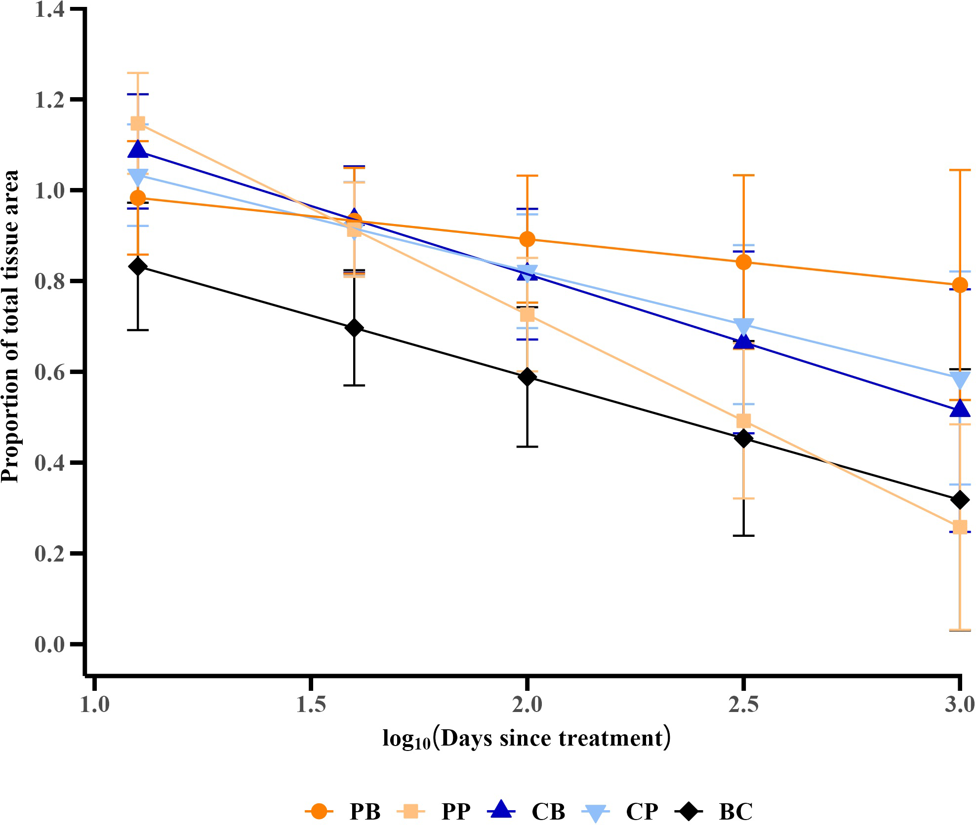 Trends in the proportion of total tissue area remaining, derived from a generalized linear mixed effects model controlling for covariates [initial total tissue area and initial condition (proportion of initial total tissue area over total skeletal area) of the colony]. Values are means ± 95% confidence intervals. Treatment codes include probiotic bag (PB, dark orange circle), probiotic paste (PP, light orange square), control bag (CB, dark blue up triangle), control paste (CP, light blue down triangle), and background control (BC, black diamond).