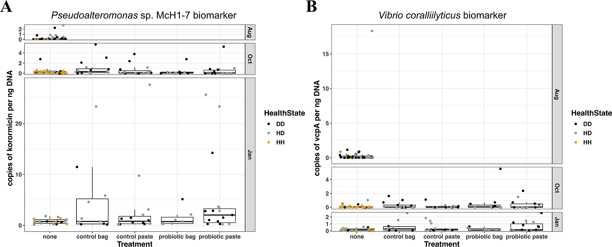 (A) Gene copies per ng DNA of the Pseudoalteromonas sp. strain McH1–7 biomarker (part of the korormicin biosynthetic gene cluster) in Montastraea cavernosa corals sampled 13 days before probiotic treatments, ~2 weeks after the second probiotic treatment (day 59), and ~3 months after the second probiotic treatment (day 136). (B) Gene copies per ng DNA of the Vibrio coralliilyticus biomarker vcpA vibriolysin-like metalloprotease in Montastraea cavernosa corals sampled 13 days before probiotic treatments, ~2 weeks after the second probiotic treatment (day 59), and ~3 months after the second probiotic treatment (day 136). Colors indicate the health condition of the coral tissue where DD, diseased tissue; HD, apparently healthy tissue on diseased colony; HH, healthy tissue on healthy untreated colony.
