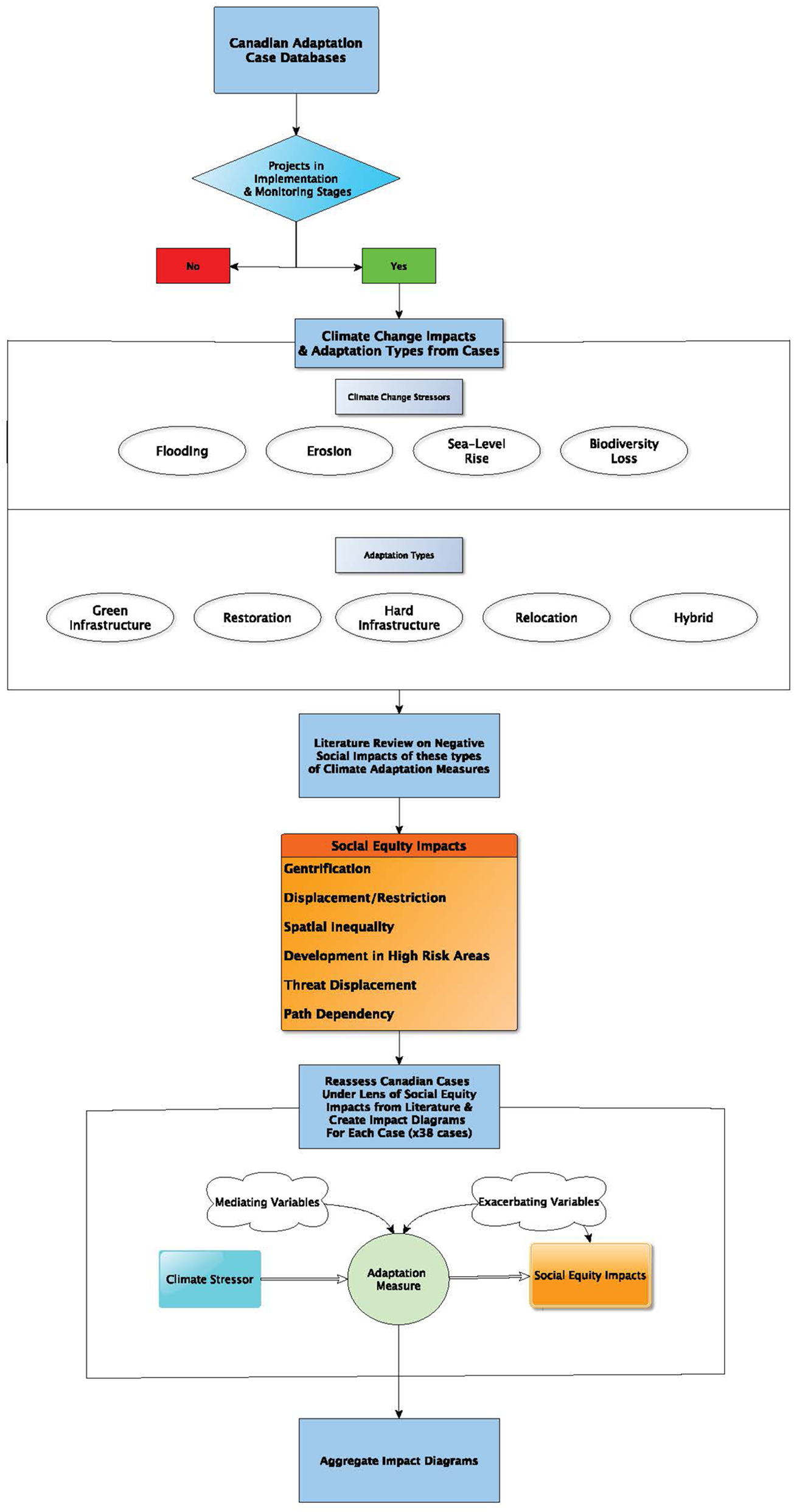 Our research approach began with a database scan of Canadian adaptation projects, followed by a literature review focused on identifying potential maladaptions from these types of adaptation projects. We conducted a survey of potential social maladaptations from climate adaptation projects based on the current adaptation interventions being/having been implemented along Canada’s coastline. The Canadian adaptation cases were categorized by type of intervention. While frameworks of adapting to climate impacts exist which categorizes adaptation projects based on whether they protect, accommodate, or retreat (PAR framework) from climate impacts, we chose not to follow these existing frameworks. Frameworks such as PAR are not intended to forecast maladaptation from projects, and in order to understand unique maladaptive impacts from different project types we instead chose to categorize based on the kind of intervention they had to address climate impacts (Dronkers and Mulder, 1990). Using this list of adaptation types, we conducted a literature review focused on identifying the different social equity impacts reported from similar interventions globally. A corresponding list of potential social equity impacts was generated related to the adaptation categories. From this review, we developed conceptual models (called “impact diagrams”) of potential maladaptations for each Canadian case. We assessed these project types using a social equity lens, to identify the potential social equity impacts of different adaptation projects. We then coalesced the individual cases into broader categories of adaptation types and impacts, finishing with the creation of aggregate impact diagrams. The following diagram provides a visual overview of our methods approaches, and the following sections provide more details for each step of the process. See Figure 1 for a visual overview of our methods.