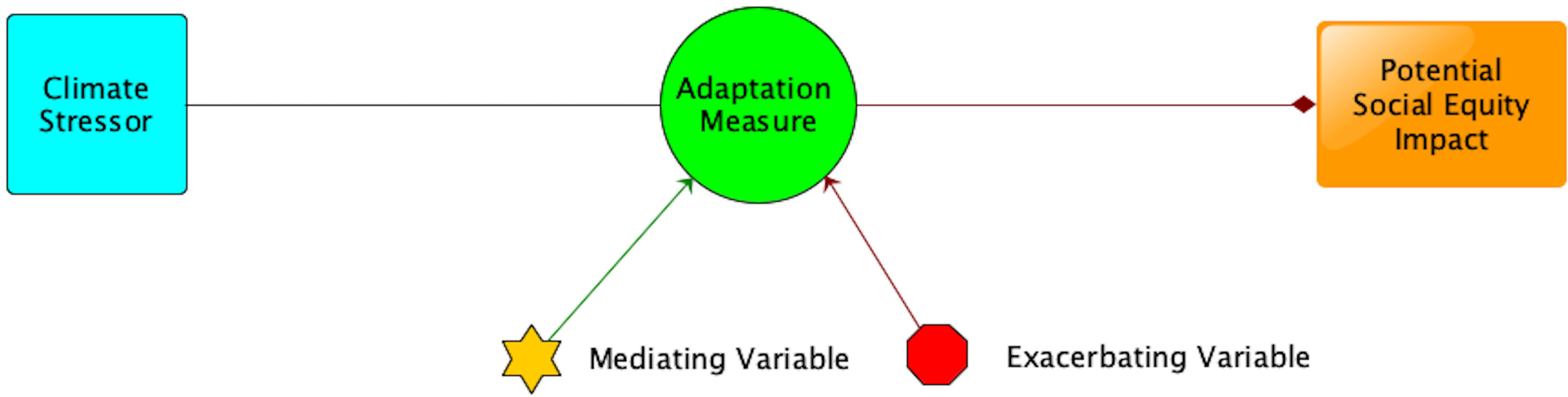Impact Diagram Model – Climate Stressor instigates an Adaptation Measure, the star represents any Mediating Variables in the planning, implementation, and monitoring stages that would mediate potential negative social impacts, the red hexagon represents any Exacerbating Variables that would exacerbate the potential for social harm. The Adaptation Measure is connected by an arrow to the Potential Social Equity Impact.