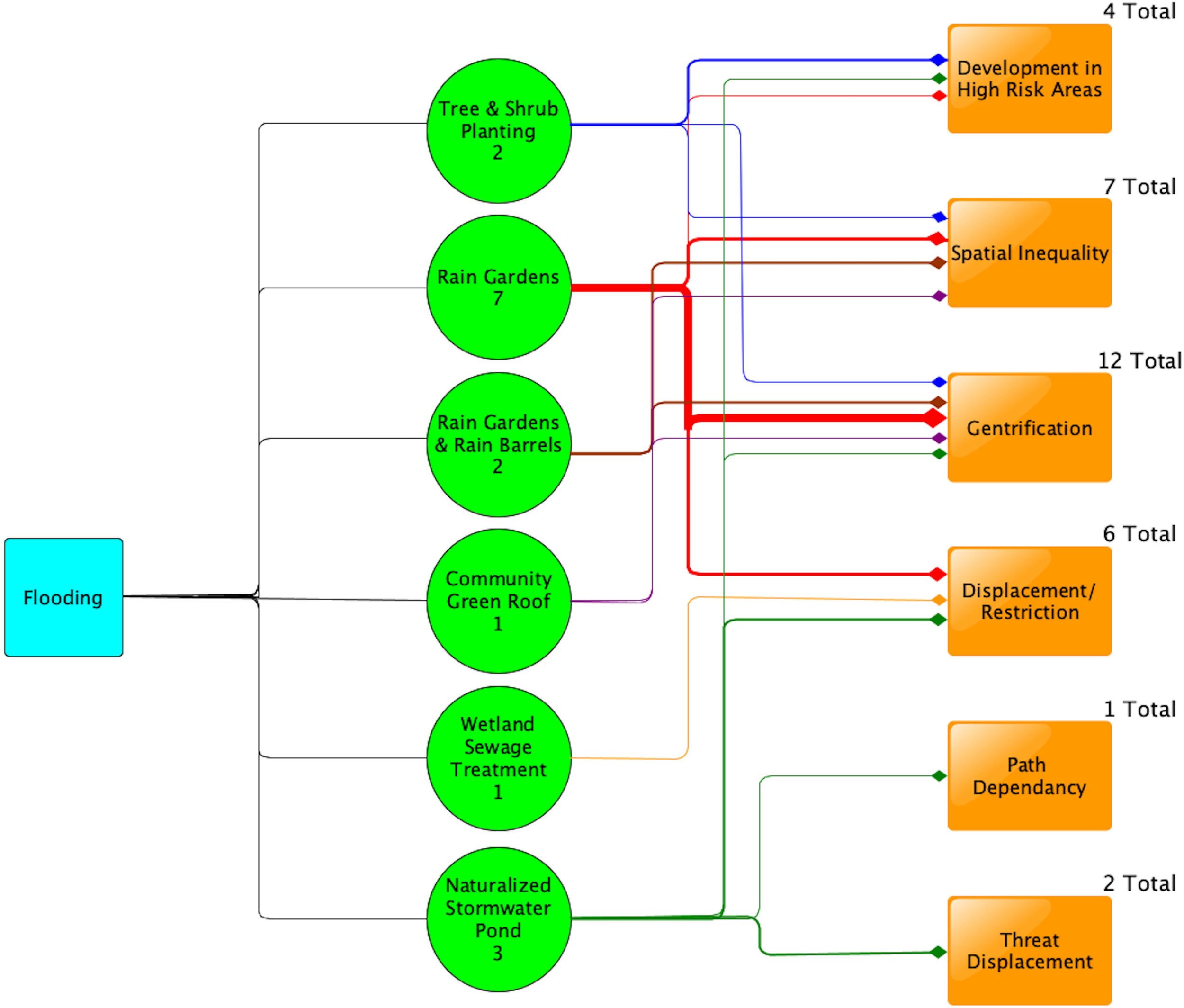 Flooding adaptation by green infrastructure. These impact diagrams show what kinds of interventions are being implemented to address each climate stressor, and the potential social equity consequence of each intervention. The climate stressor is connected to all adaptation measures in the diagram as the driving force of intervention. The adaptation cases are in the center of the diagrams and further separated by adaptation type: Green Infrastructure, Restoration, and Hard Infrastructure/Hybrid/Other. This categorization is represented by color; green nodules represent green infrastructure projects, yellow/green represents restoration, and orange, brown, and purple represent hard infrastructure, hybrid, and relocation, respectively. The amount of adaptation cases in each nodule is represented by the number within the circle and through the thickness of the arrows connecting the intervention to the potential impact nodules. The thicker the lines are, the more cases are represented to have potential impacts associated with that intervention. The potential impact nodules are colored bright orange and are situated on the furthest right of the diagrams. The number of cases associated with them in each diagram is depicted in the ‘total’ above each impact nodule.
