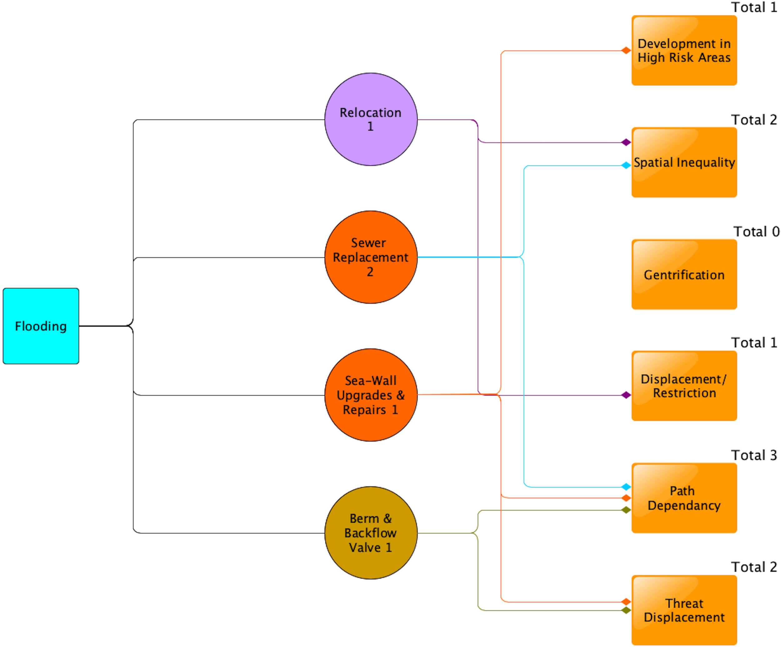 While the individual cases generated a wider and more specific variety of potential impacts, the final diagrams use the generic categories of impact developed from the literature review to aid in generalization (Table 1). These impacts are development in high-risk areas, spatial inequality, gentrification, displacement/restriction, path dependency, and threat displacement. For example, educational and physical accessibility inequality are represented within spatial inequality, entrenchment is encompassed within path dependency, and false sense of security is encompassed within development in high-risk areas as an initiator of development in disaster prone areas.