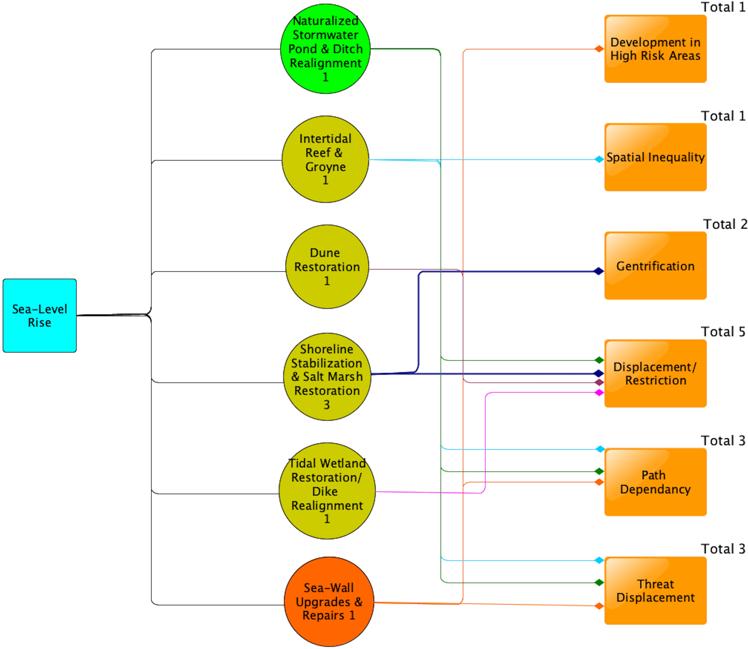 Sea-level rise adaptation by green infrastructure, restoration, and a hard infrastructure project. The same description of the diagram in Figure 3 applies here.