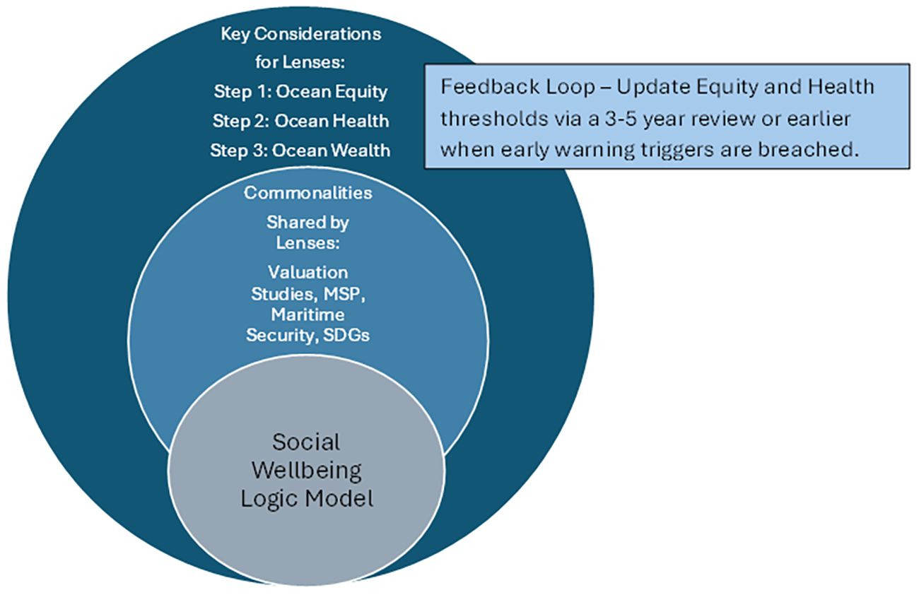 Figure 2 illustrates the synthesis of interconnections, including commonalities shared across all lenses and key considerations unique to each lens, between the various Blue Economy lenses and the Social Wellbeing model within the BEDA framework. This visualization demonstrates how these elements work together to align TBL objectives with the commonalities, and SDGs, fostering a cohesive and integrated approach to sustainable development.