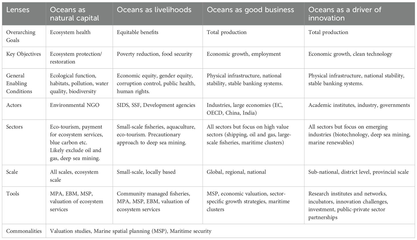 The defining attributes of these dominant lenses are summarized in Table 1. Although each lens stresses a particular pillar - environmental, social, or economic, they share important commonalities, such as the use of valuation studies (e.g., quantifying ecosystem services) and reliance on cross-sectoral tools like Marine Spatial Planning (MSP) (Voyer et al., 2018).