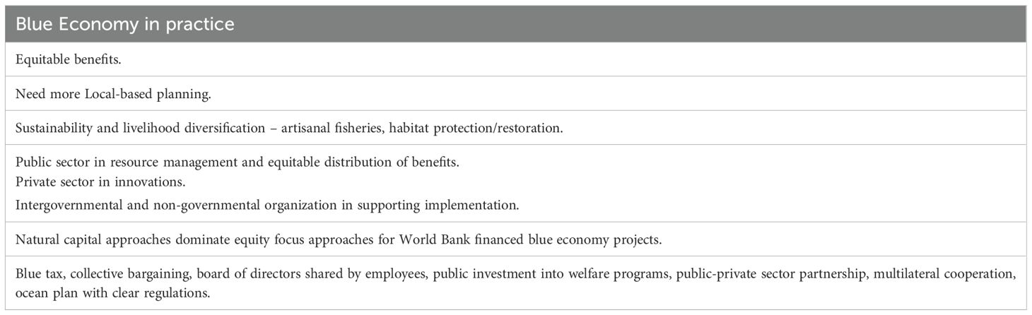Various definitions of the Blue Economy emphasize the sustainable use of ocean resources for economic growth, improved livelihoods, and jobs, while preserving ocean health (World Bank, 2017; HLP, 2023a, b). However, as Voyer et al. (2018) and Silver et al. (2015) observe, there are four major “lenses” through which the Blue Economy is interpreted, which are as follows: