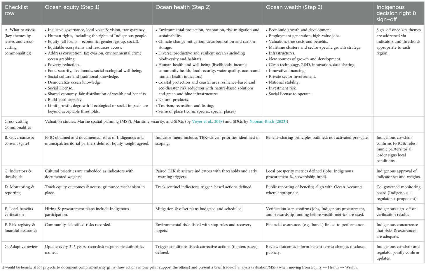 Keywords: blue economy, indigenous co-governance and FPIC, marine spatial planning (MSP), ocean accounts/natural capital accounting, performance-based assessment, adaptive governance, equity-health-wealth sequencing
