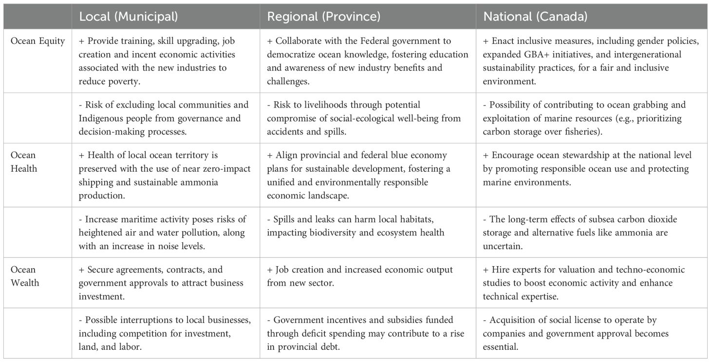 Canada’s pursuit of a Blue Economy strategy, as evidenced in various national policies (e.g. Fisheries and Oceans Canada, 2021, 2022a, 2024a), similarly grapples with definitional ambiguity and inconsistent prioritization. Many high-level documents highlight sustainable use of ocean resources (e.g. World Bank, 2017; HLP, 2023a, b) but do not fully clarify how to integrate social equity (ocean equity) with environmental health (ocean health) and economic viability (ocean wealth). Compounding the challenge is a persistent “business as usual” mindset in ocean industries, which often treats social, environmental, and economic factors in isolation instead of as interlinked priorities. Failing to cohesively address TBL objectives poses significant risks to both human well-being and the marine environment (Bennett et al., 2019).