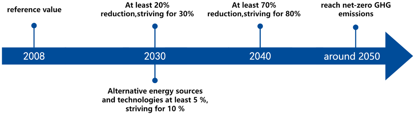 The IMO’s updated GHG Emission Reduction Strategy, adopted at MEPC80 in 2023, sets a long-term net-zero target for international shipping by 2050, aligning with the Paris Agreement’s goals (IMO, 2023). As shown in Figure 1, the strategy includes targets for alternative fuel adoption, aiming for 5-10% of international shipping to use zero or near-zero GHG technologies by 2030. It also sets GHG reduction milestones: 20-30% by 2030 and 70-80% by 2040, compared to 2008 levels.