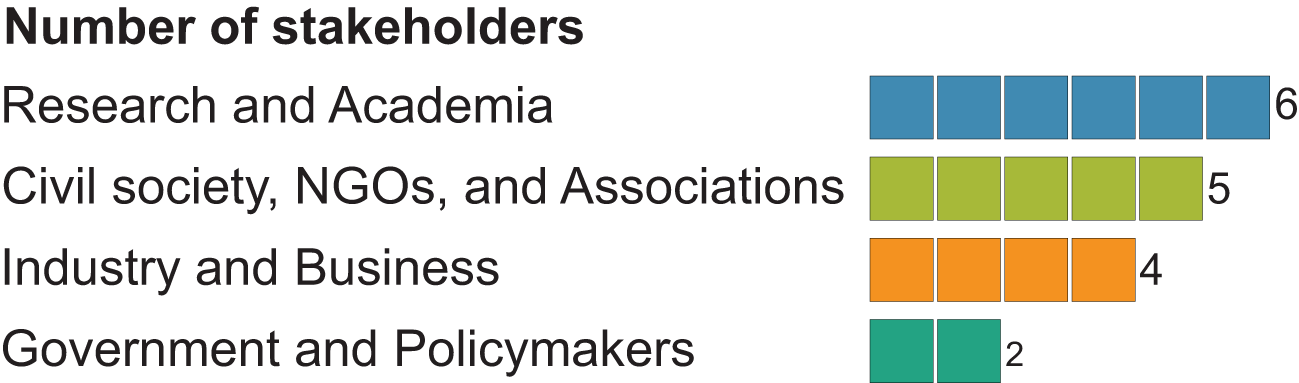 The second interactive session focused on the top eight sectors that received the most votes. Stakeholders were then asked to provide feedback on sticky notes addressing the political, environmental, social, technical, legal, and economic challenges relevant to these sectors (Figure 3). The feedback was then anonymously shared with the panel for further discussion to identify and validate the needs and gaps.