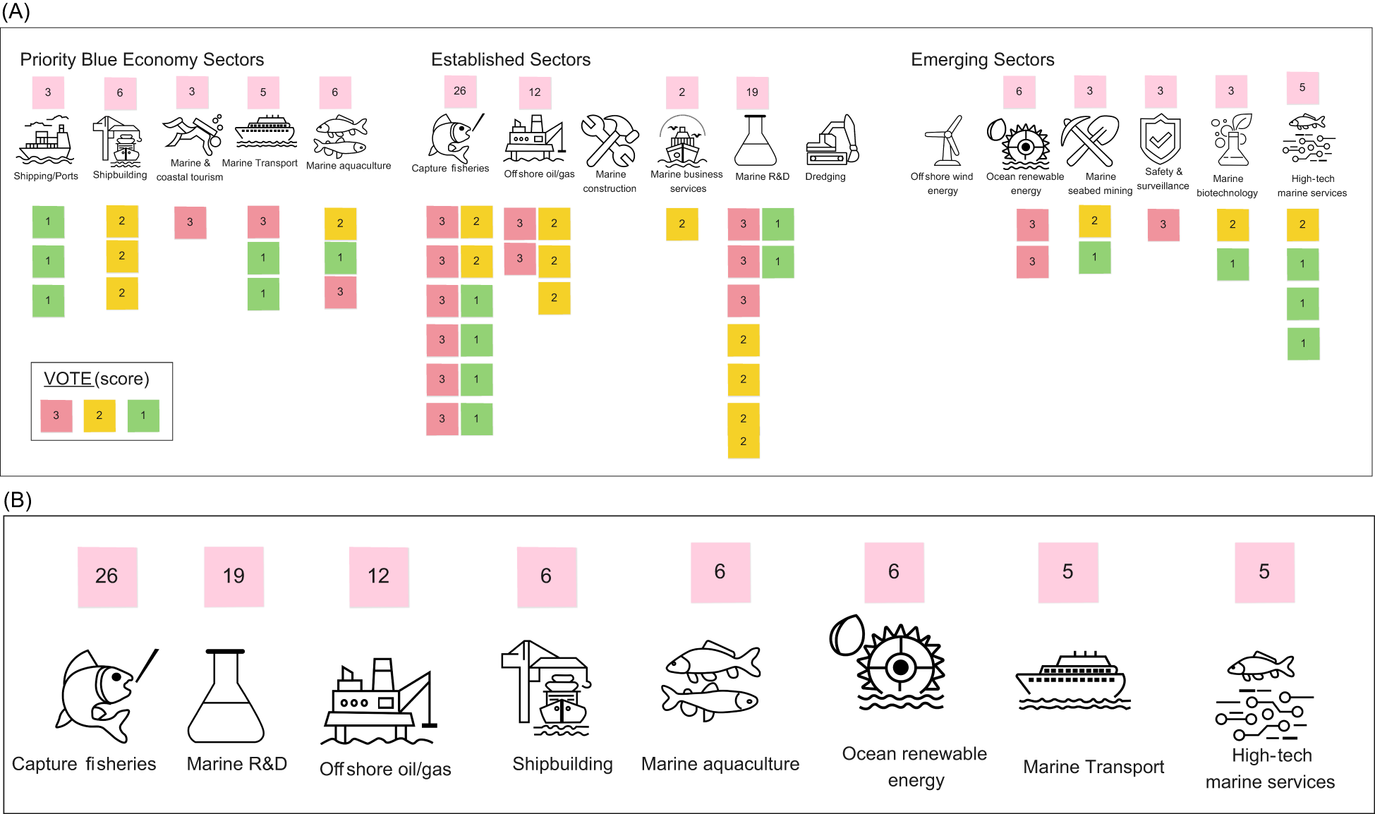 The first interactive session provided stakeholders with three weighted votes, scored as 1, 2, and 3, to allocate among three of the 17 Blue Economy sectors to assess their importance and the immediate need for action (Figure 2).