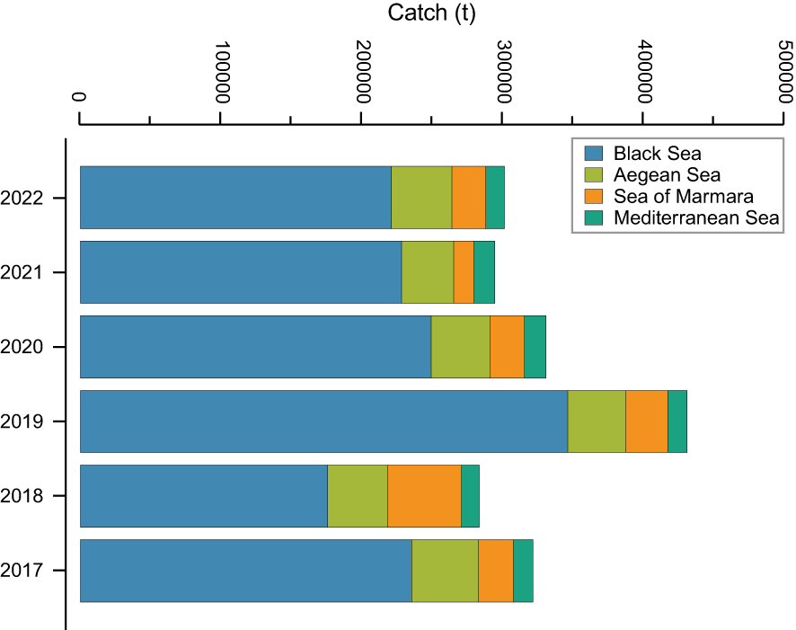 Wild-caught fishing volume in Turkish seas (tons) (TÜİK, 2023).