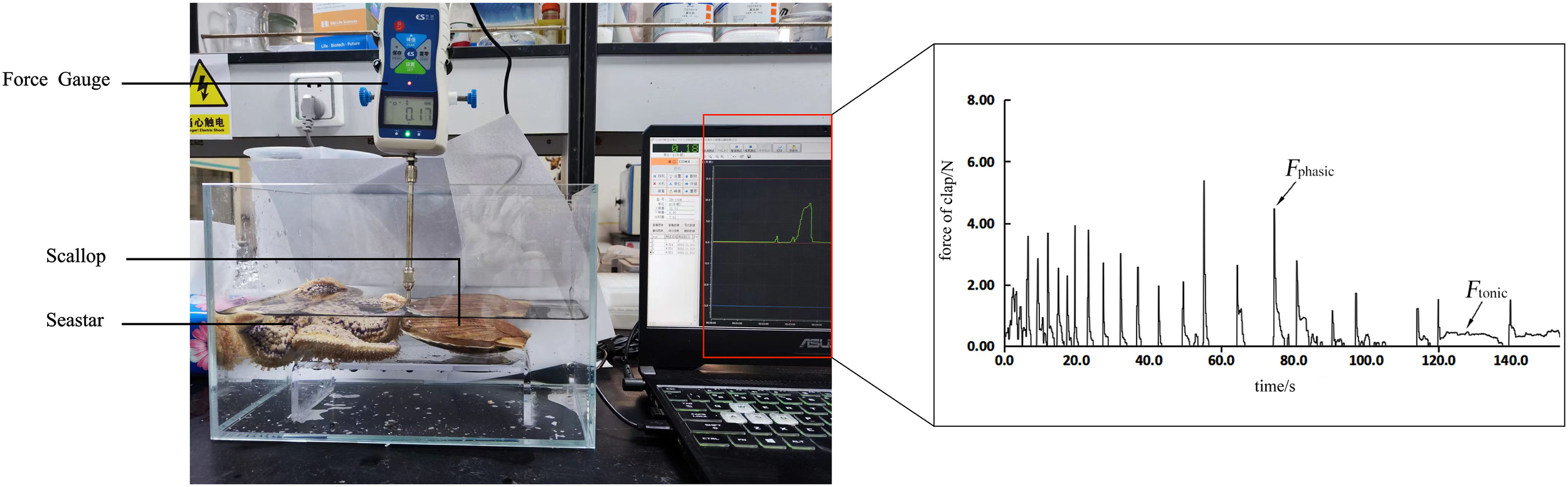 The scallop was placed in a glass tank (50 × 30 × 35 cm) with the lower valve fixed to a platform, while the upper valve was connected to a digital force gauge (Nscing SH - III - 100N, Suce, Nanjing, China). The gauge recorded the force, number and time data, which were transmitted to a computer (Figure 1). The experiment was conducted in two groups: a control group (sea star absent) and an experimental group (sea star present). To minimize variability, sea stars of similar size were selected, and each experimental tank contained one sea star and one scallop, with the sea star’s arm in contact with the scallop shell. Each stimulation lasted for 3 minutes. Fifteen scallops from each size class were tested per group as biological replicates.