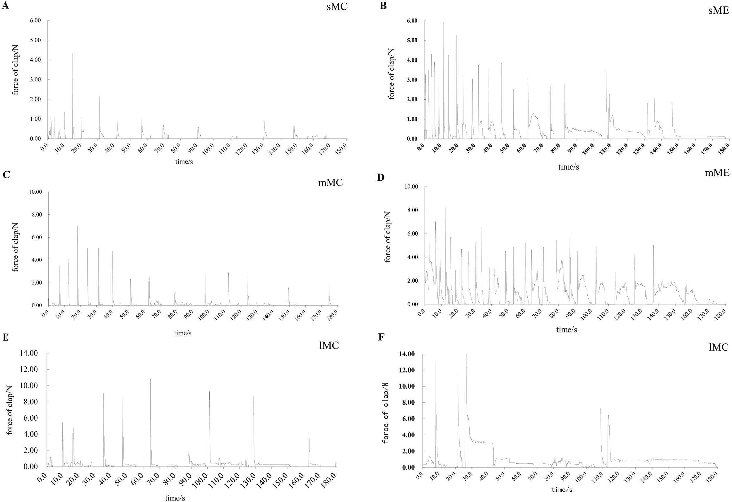 Typical force recordings illustrate differences in both the magnitude and temporal patterns of force production among size classes and between control and experimental conditions. (A) Control group of small size class M. yessoensis (sMC), (B) Experimental group of small size class M. yessoensis (sME), (C) Control group of medium size class M. yessoensis (mMC), (D) Experimental group of medium size class M. yessoensis (mME), (E) Control group of large size class M. yessoensis (lMC), (F) Experimental group of large size class M. yessoensis (lME).