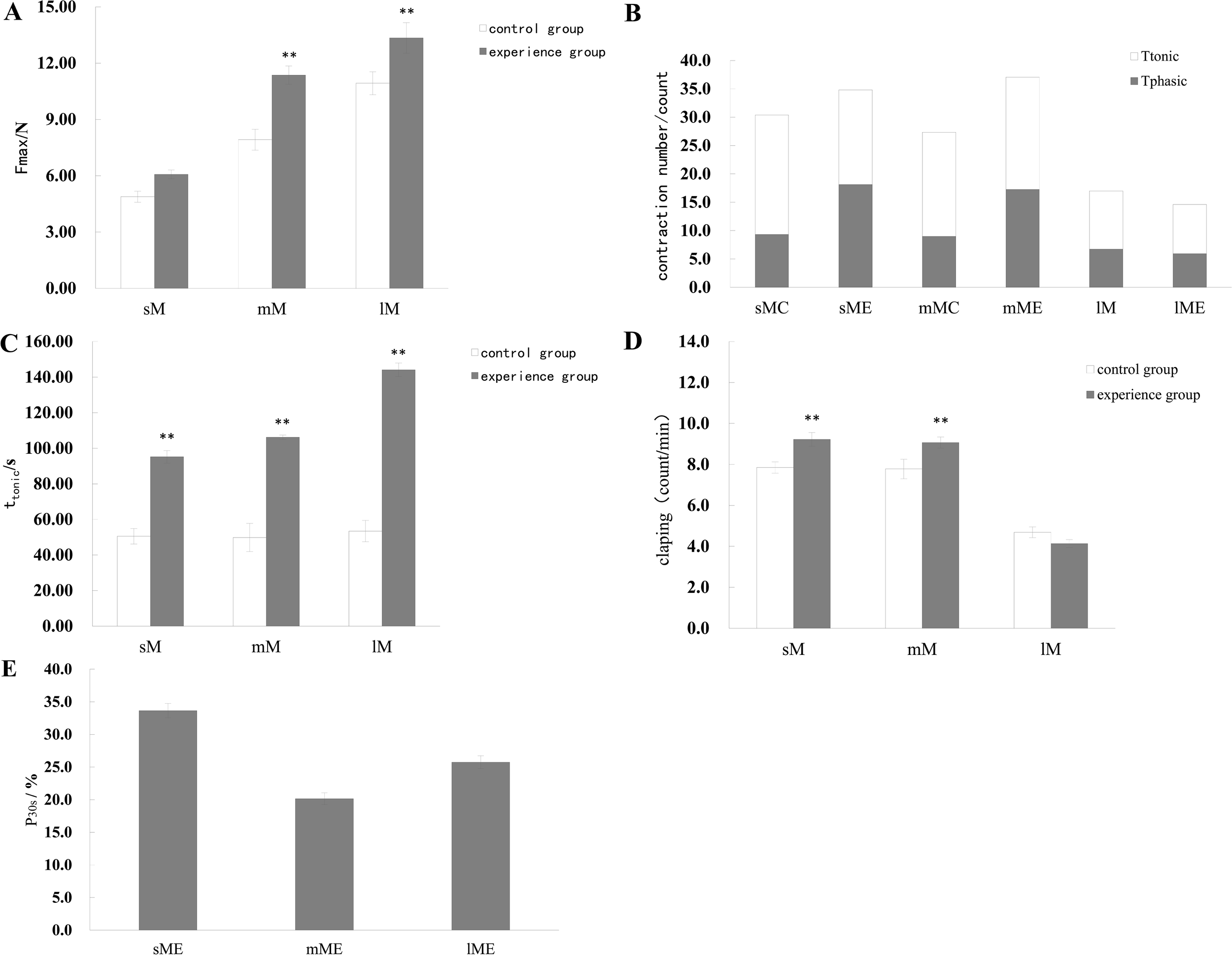 Shell clapping response parameters related to phasic contractions in M. yessoensis in response to predation. (A) Maximum contraction force (Fmax), (B) Total number of contractions, separated into phasic and tonic types, (C) Duration of tonic contractions (ttonic), (D) Frequency of shell clapping (in counts per minute), and (E) Percentage of time within the first 30 seconds that the scallop shell remained closed. Asterisks indicate statistically significant differences between groups: P < 0.05 (*), P < 0.01 (**). Sample size: n = 15, data are presented as mean ± SD.