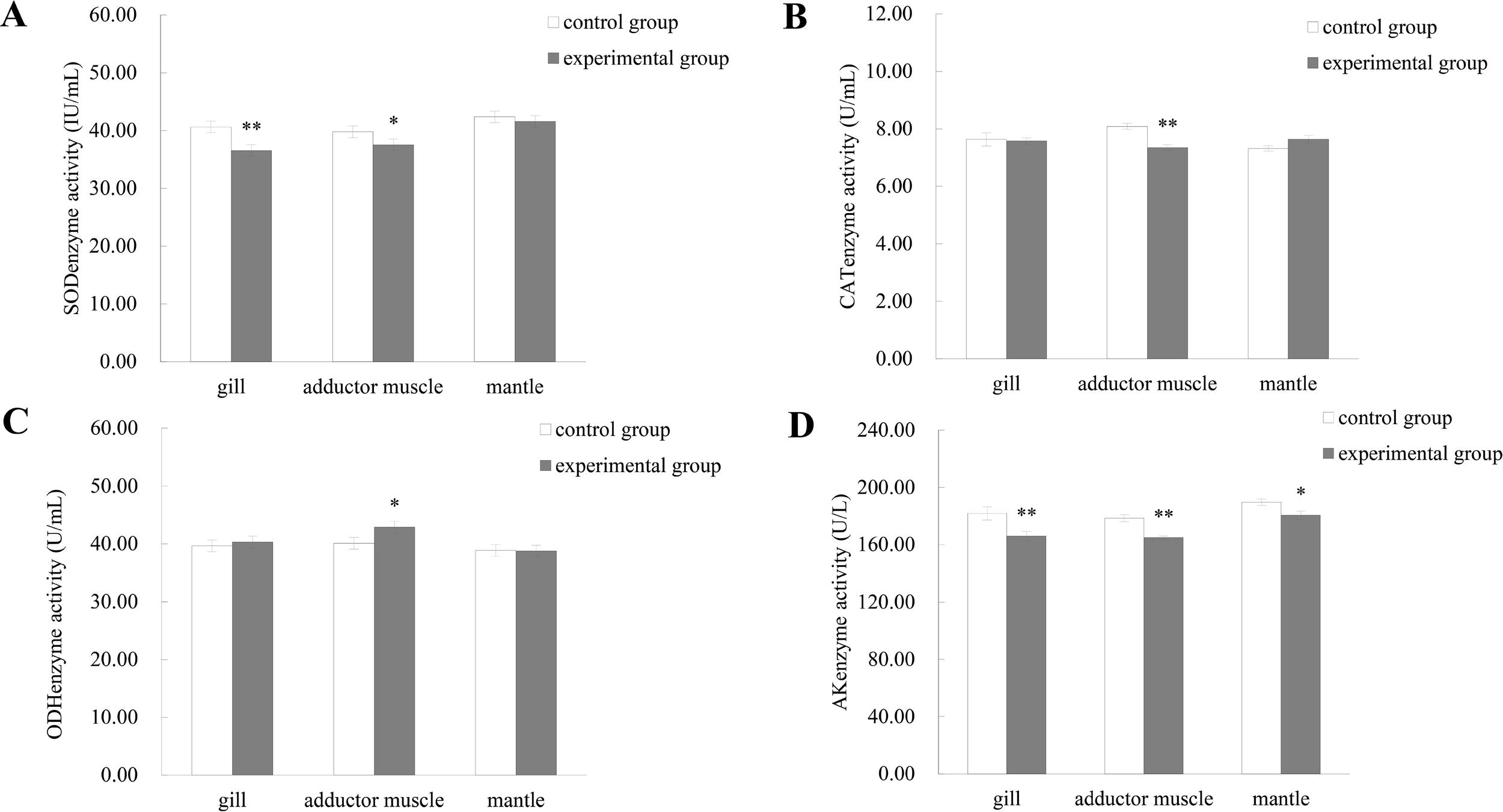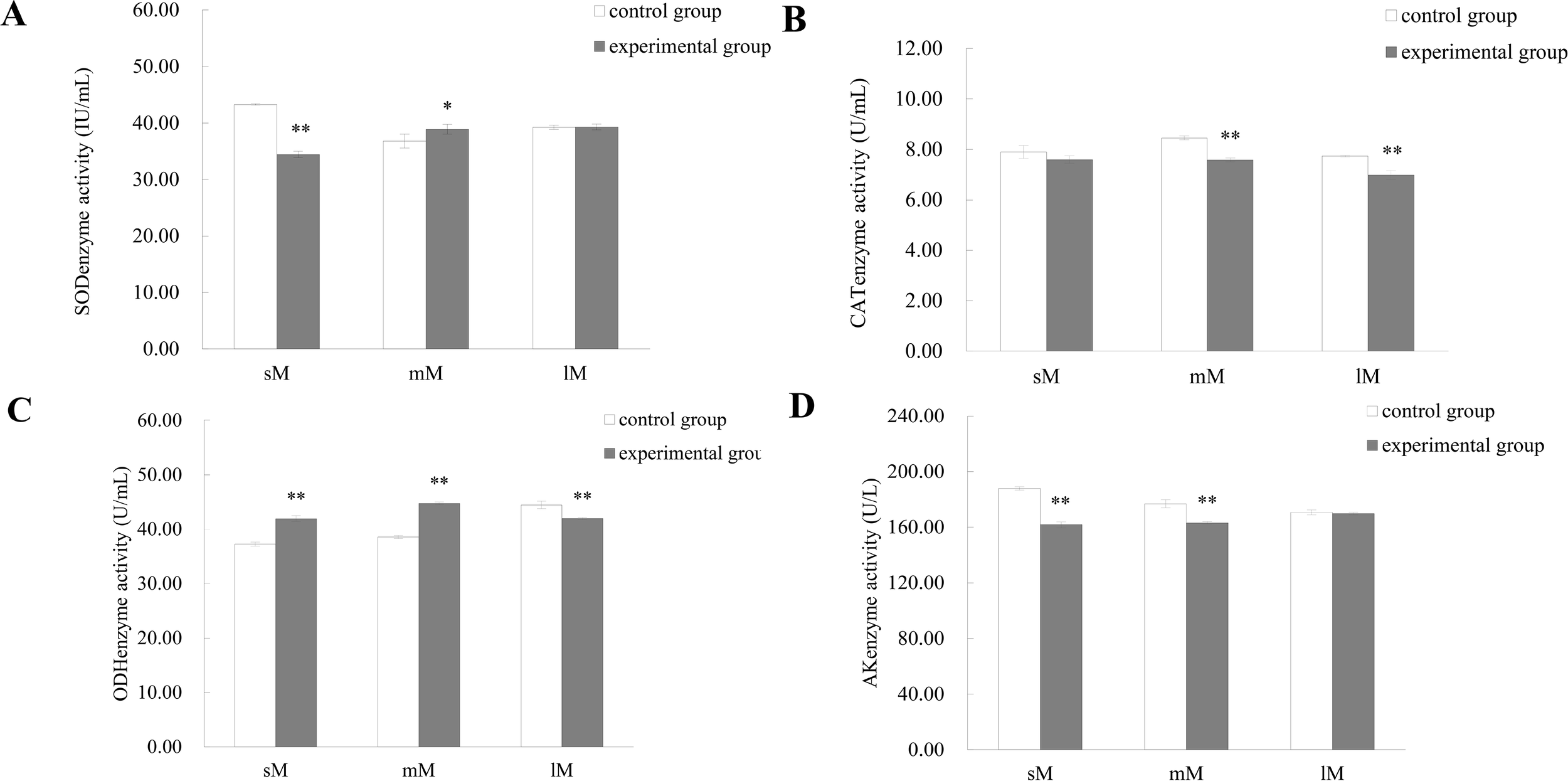 A more detailed breakdown of enzyme activity in adductor muscles by size class is shown in Figure 5. In large scallops, CAT and ODH levels dropped significantly (P < 0.01), from 7.74 ± 0.21 U/mL and 43.08 ± 1.42 U/mL in controls to 6.98 ± 0.20 U/mL and 42.60 ± 0.62 U/mL, respectively. Medium - sized scallops showed significant changes in all four enzymes: SOD declined from 40.47 ± 1.61 IU/mL to 37.20 ± 1.29 IU/mL (P < 0.05), and CAT, ODH, and AK were all highly significantly reduced (P < 0.01). In small scallops, CAT activity remained unchanged, while SOD, ODH, and AK were significantly altered (P < 0.01).