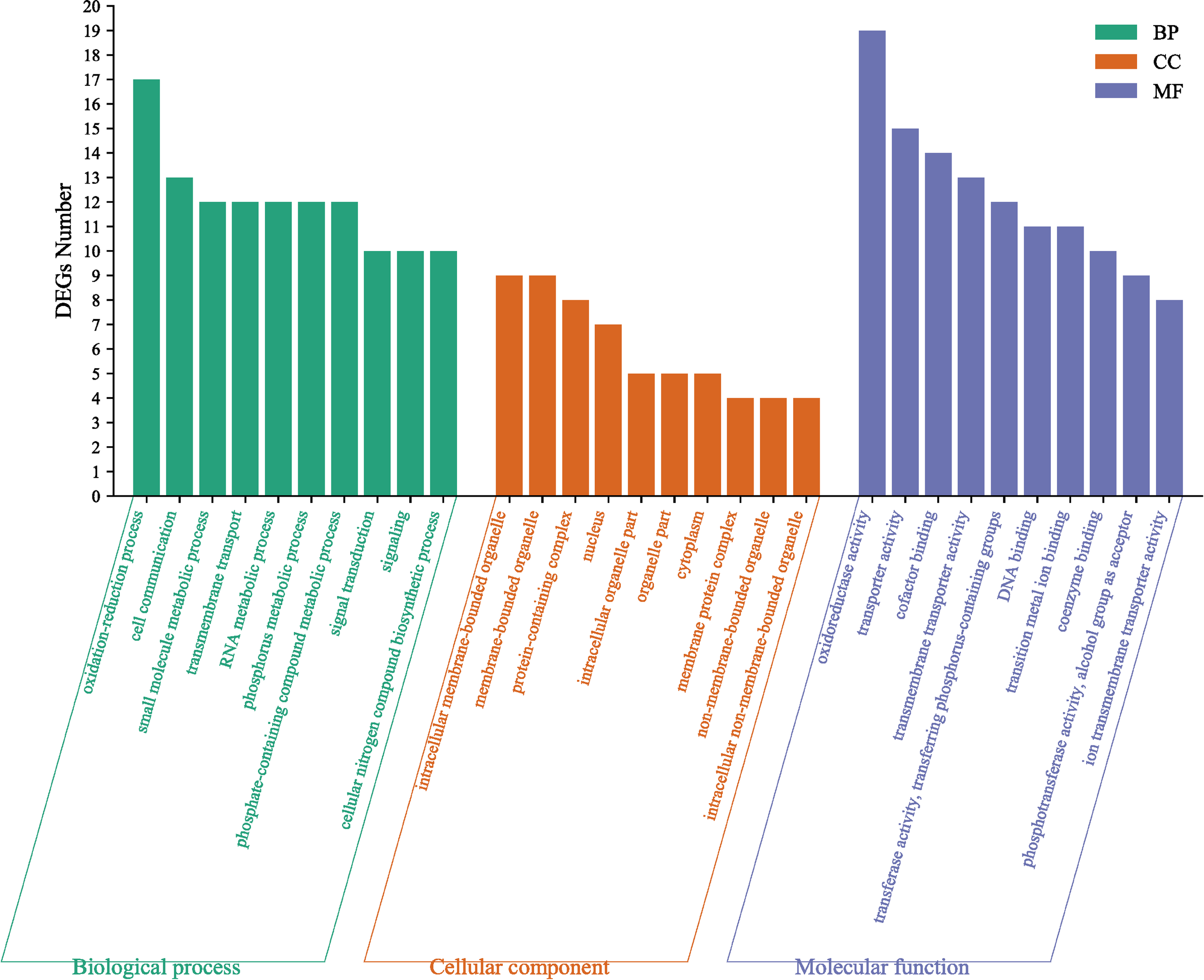 Gene Ontology (GO) terms were classified into biological processes (BP), cellular components (CC), and molecular functions (MF). Figure 7 presents the top ten enriched GO terms in each category. These included oxidoreductase activity (MF), oxidation-reduction process (BP), and intracellular membrane-bounded organelle (CC). Although most GO terms were not statistically significant (P > 0.05), 14 GO terms achieved significance (P < 0.05), notably including carboxylic acid metabolic process, organic acid metabolic process, oxoacid metabolic process (BP), and coenzyme binding (MF).