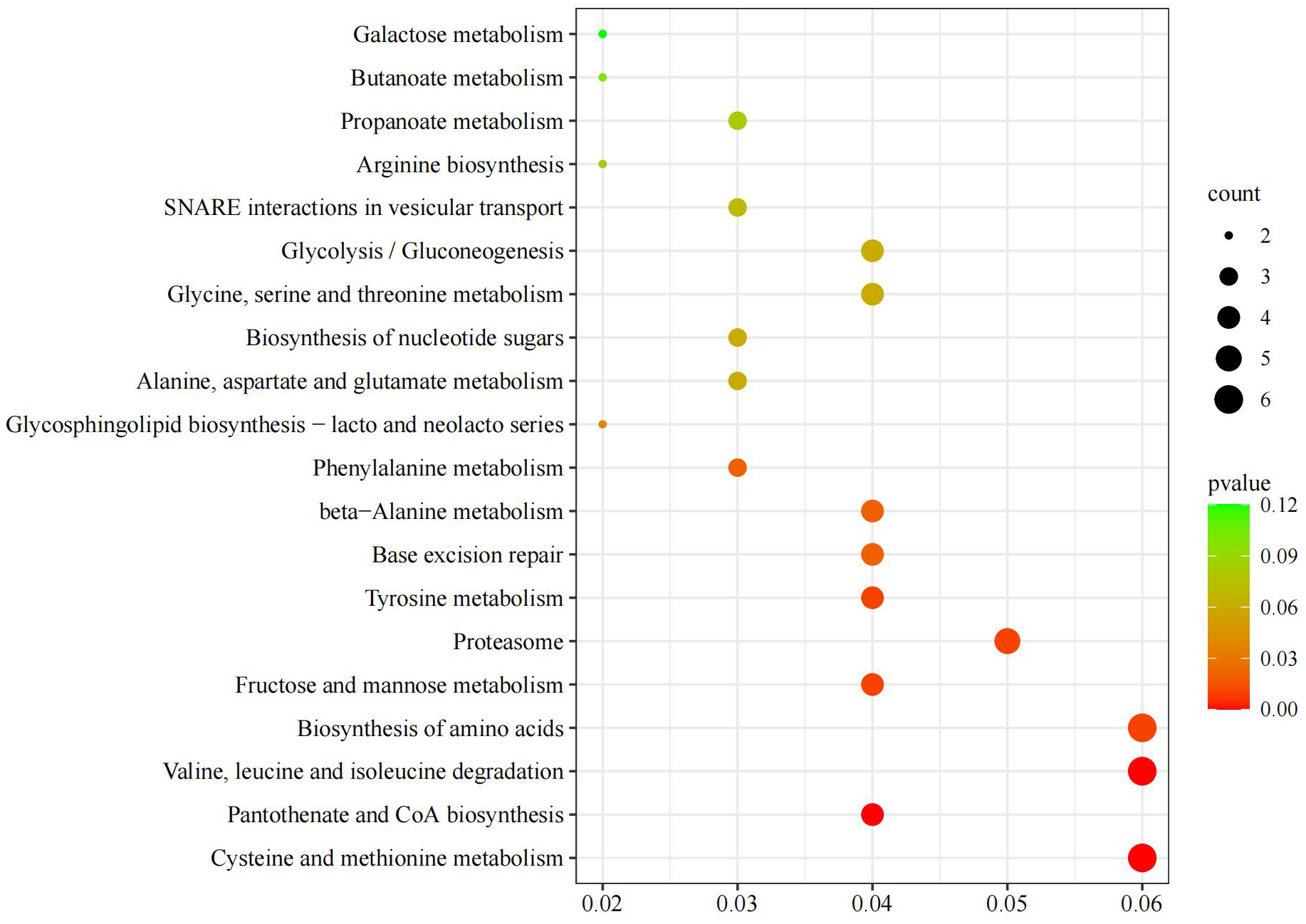 KEGG pathway analysis identified 101 biological pathways, among which cysteine and methionine metabolism, pantothenate and CoA biosynthesis, branched - chain amino acid degradation (valine, leucine, isoleucine), and tyrosine metabolism were significantly enriched (P < 0.01) (Figure 8).
