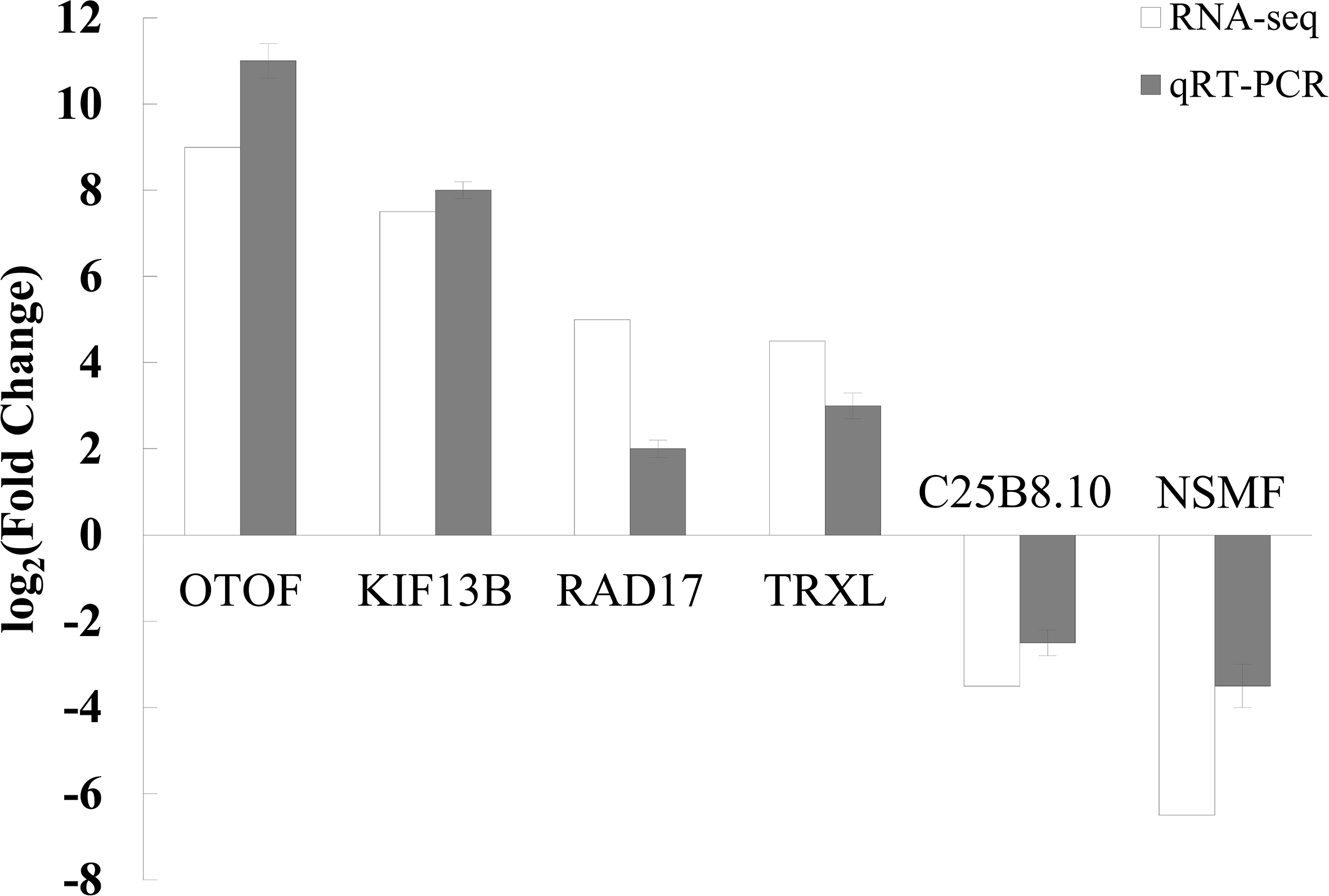 To validate the RNA - seq results, six DEGs were randomly selected for qRT - PCR analysis: kinesin protein 13B (KIF13B, LOC110458105), cytochrome P450 (P450, LOC110459241), thioredoxin (TRXL, LOC110449874), cell cycle checkpoint protein 17 (RAD17, LOC110466699), otoferlin (OTOF, LOC110467166), NMDA receptor synaptonuclear signaling and neuronal migration factor (NSMF, LOC110459652), and an uncharacterized methyltransferase (C25B8.10, LOC110461631). The qRT - PCR results were consistent with RNA - seq data, showing a strong correlation (R² = 0.81) in expression trends, thereby validating the transcriptome analysis (Figure 9).