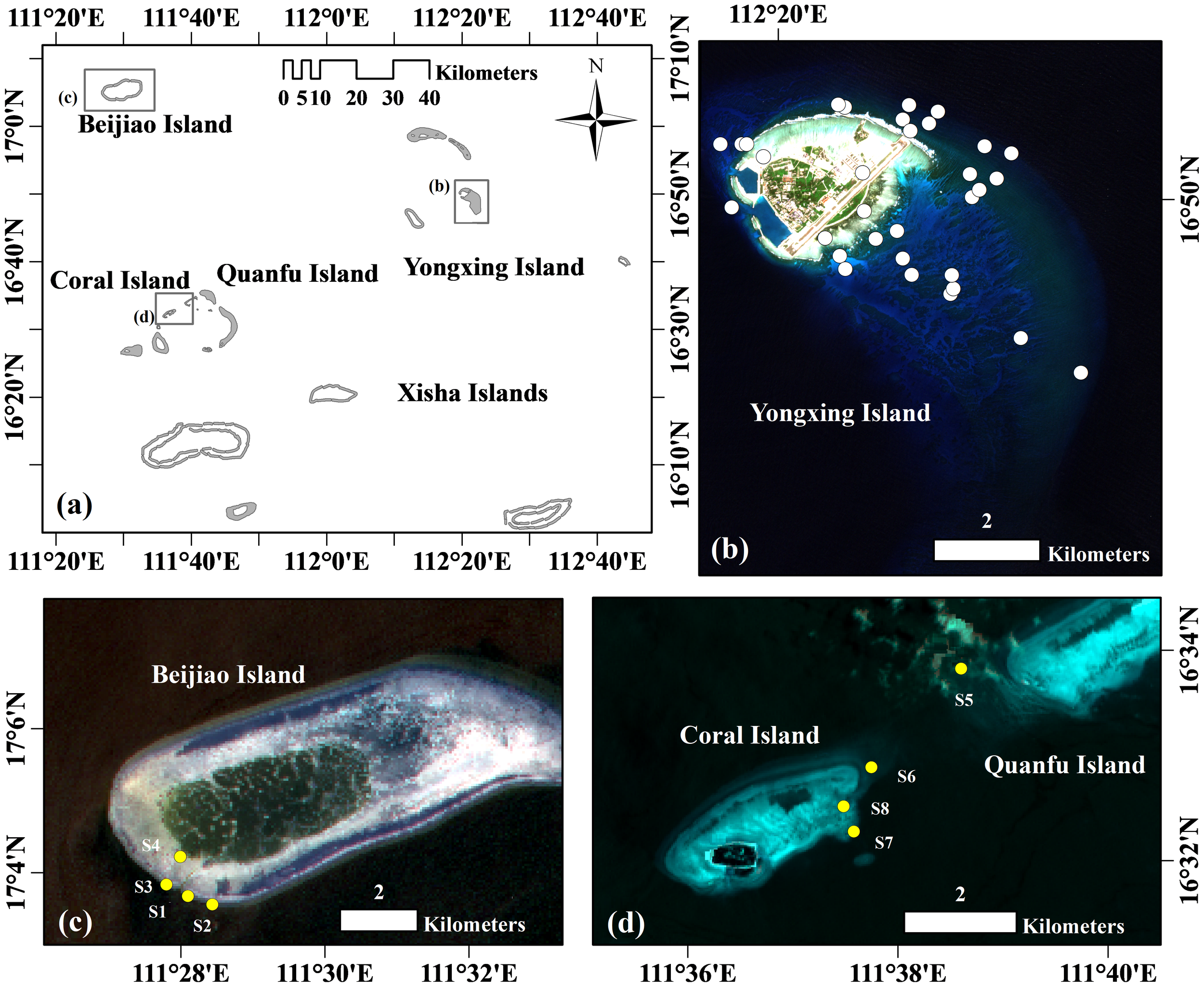 The Xisha Islands are located in the northwestern part of the South China Sea, primarily between 111°-113°E and 15°40’-17°10’N (Figure 1). A well-developed coral reef ecosystem exists within the area, with sediments composed mainly of biogenic carbonates. The reef structure consists of coral skeletons and frameworks containing both living and dead reef-building corals, while pore spaces within the skeletal frameworks support a wide variety of corals, shell fragments, and biogenic detritus (QiDong, 2014). The water in this area is typically clear, allowing visibility to depths of 20-30 meters. Hydrodynamic mixing is strong in fore- and shore-reef waters, with higher concentrations of suspended particulate matter and higher proportions of inorganic particulate matter than in the lagoon. Chlorophyll concentrations are relatively high in inshore reef waters, often reaching levels up to 10 times higher than those found in lagoons and fore-reef areas (Kai, 2022).