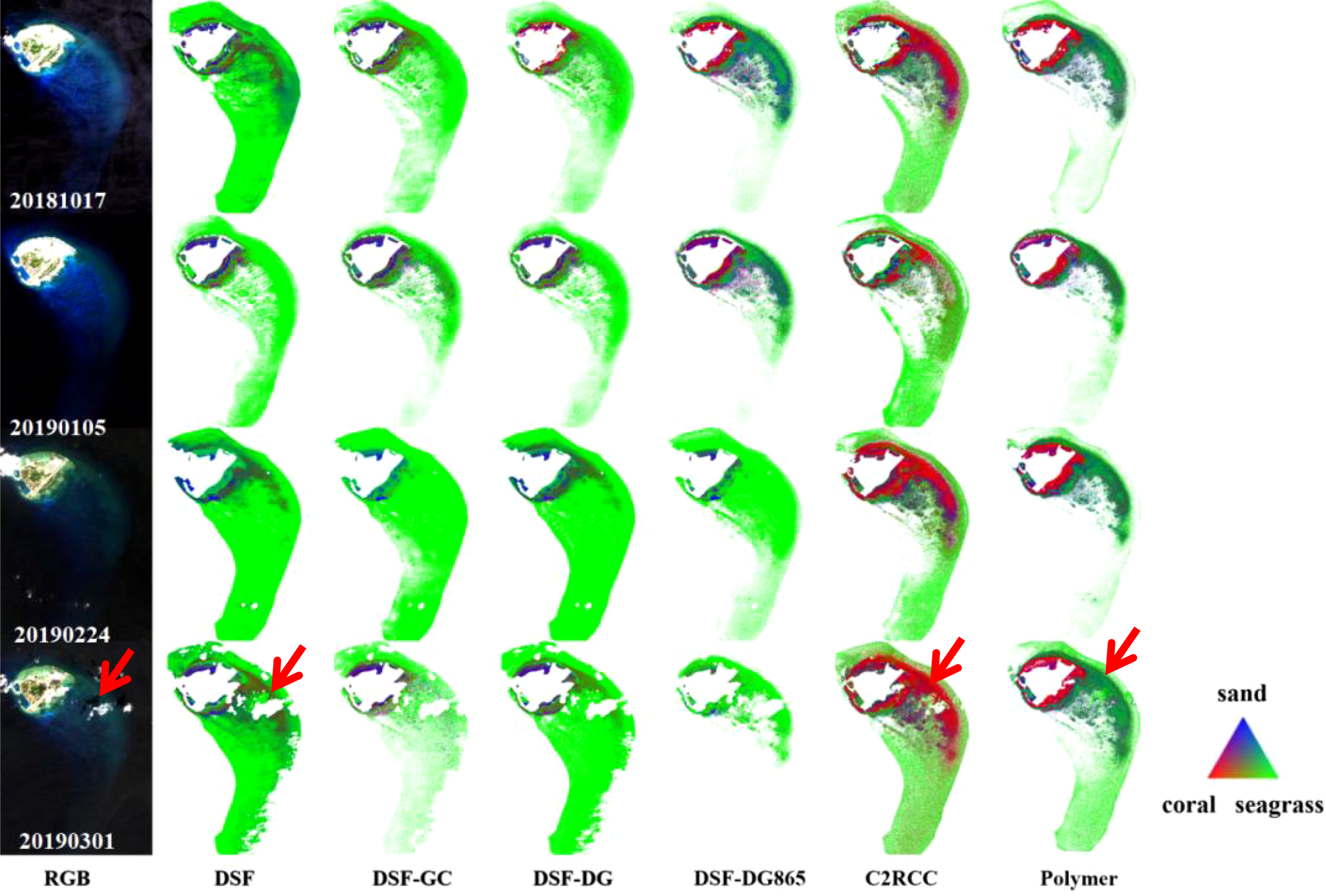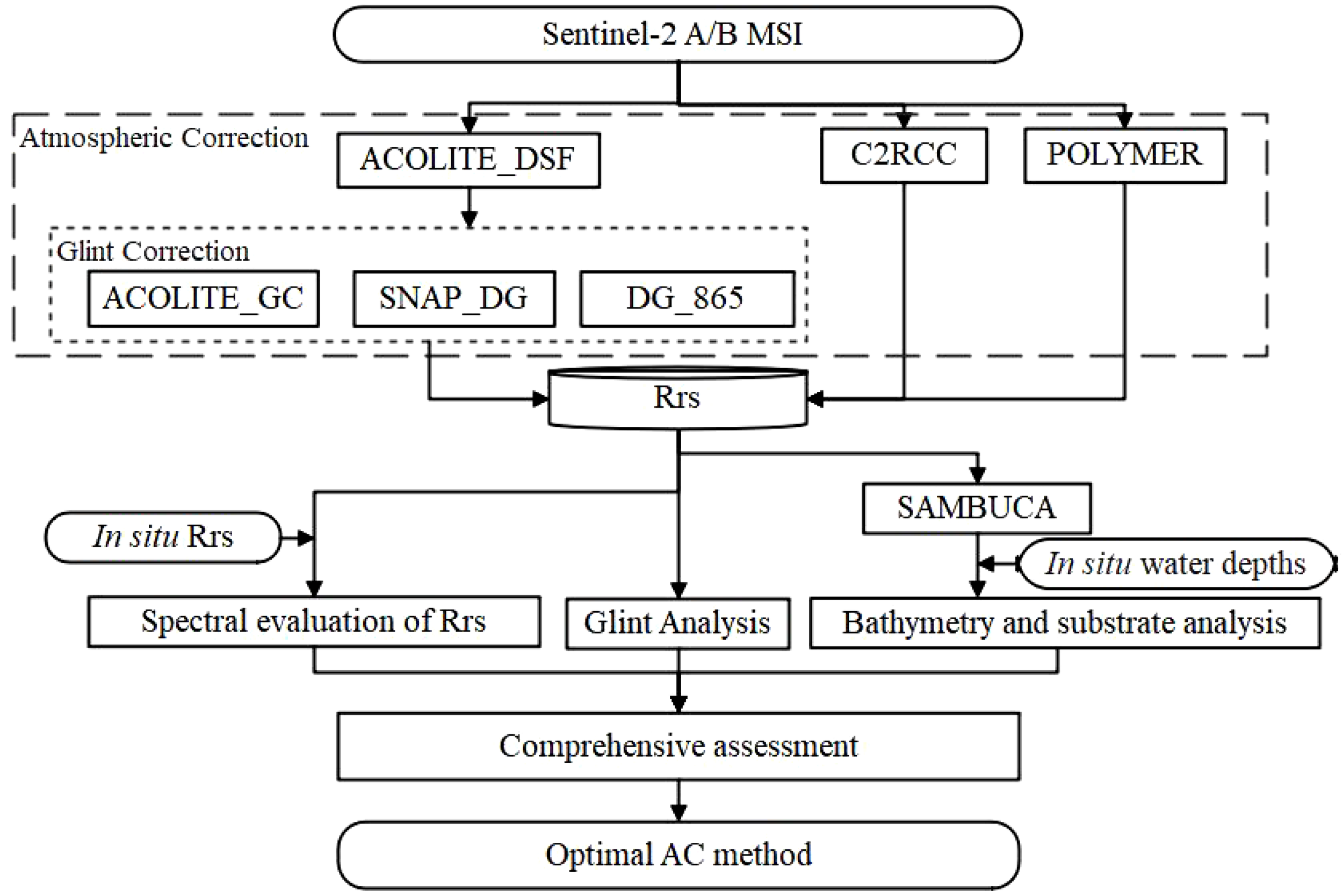 Therefore, the primary goal of this study is to access the performance of three commonly used AC algorithms and identify the optimal AC scheme for MSI imagery in optically shallow coral reef waters. The AC methods evaluated include DSF, C2RCC, Polymer, and additional sunglint correction algorithms applied to DSF. The evaluation involves comparing the AC derived Rrs spectra with in situ measurements, as well as assessing the bathymetry and substrate estimates derived from the Rrs in the Xisha Reefs, South China Sea. The findings will provide valuable insights into the application of AC methods in shallow water coral reef regions, offering strategies for precise coral reef monitoring using remote sensing techniques.