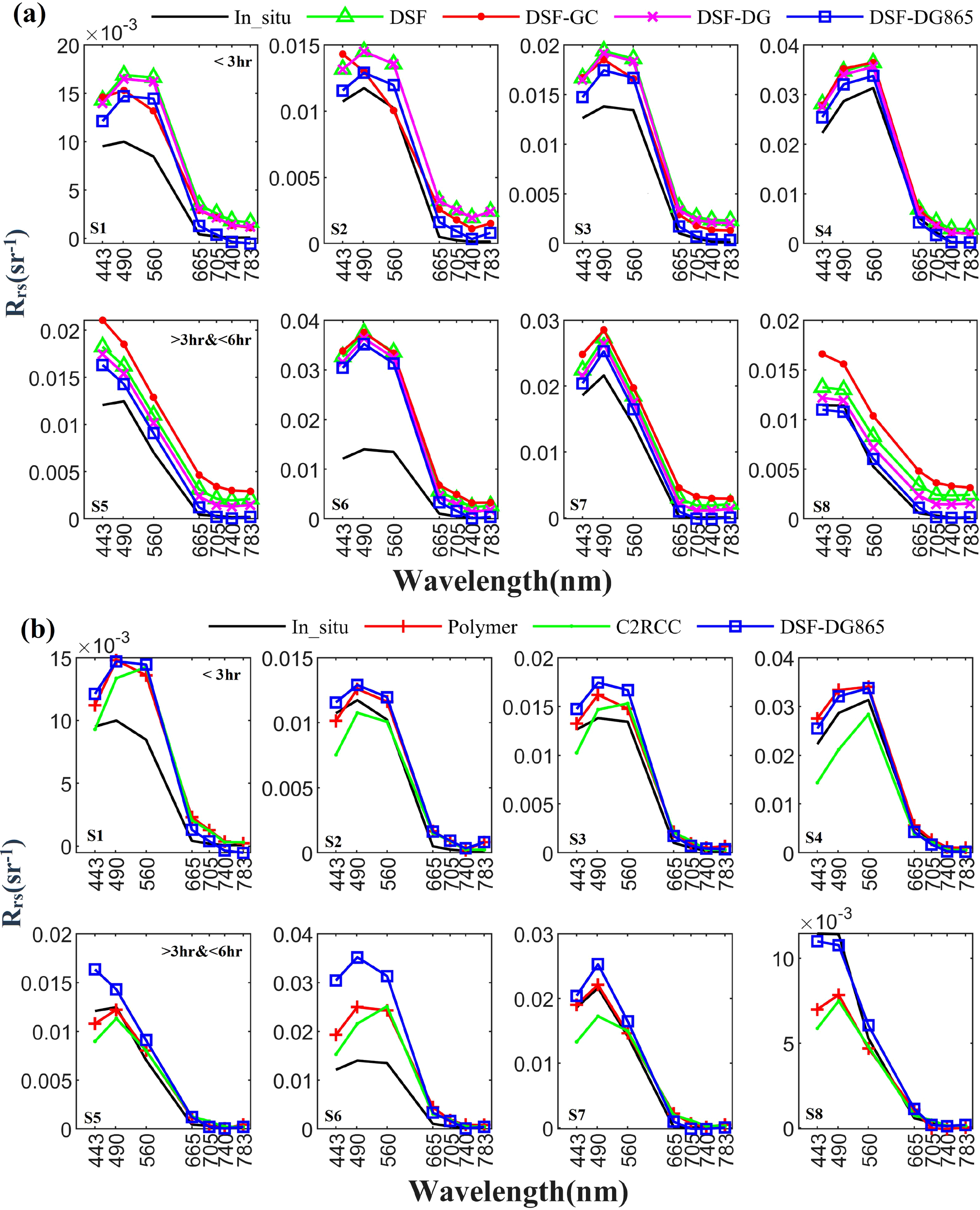 (A) Rrs derived from in-situ and MSI data using DSF AC and DSF combined with GC, DG, DG865 glint corrections. (B) Rrs derived from in-situ and MSI data using DSF-DG865, Polymer and C2RCC AC algorithms. “In-situ” and MSI data were matched within a 3/6 hour window.