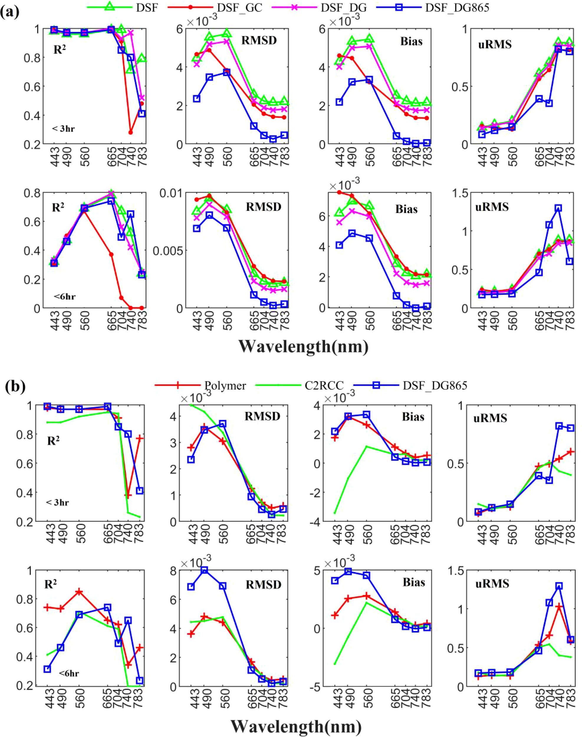 As shown in Figure 5A, all methods (DSF and DSF combined with the three glint correction algorithms) achieved high R2 value (all above 0.95) in the bands centered at 443nm to 655nm within the 3-hour match. However, in the 6-hour match, the DSF-GC method showed the lowest performance, with R2< 0.4 in the bands centered at 665nm to 783nm. Based on the assessments of R2, Bias, RMSD, and uRMS, the DSF-DG865 method clearly outperforms both the DSF-GC and DSF-DG methods. As shown in Figure 5B, Polymer method demonstrates the best performance, achieving high R2 value (all above 0.95) in the bands centered at 443nm to 655nm within the 3-hour match. In the 6-hour match, Polymer continues to excel, achieving high R2 value (all above 0.65) in the bands centered at 443nm to 655nm. Notably, R2 values range from 0.73 to 0.85 in the bands centered at 443nm to 560nm, outperforming C2RCC (R2 values: 0.41-0.71) and DSF-DG865 (R2 values: 0.31-0.74). Additionally, Polymer exhibits the most favorable metrics in Bias, RMSD, and uRMS, all of which are the smallest among the methods considered. As can be seen, the Polymer method performs well across all metrics and demonstrates superior consistency in the 6-hour match, achieving the highest R2 values and smallest deviations in key metrics. Overall, the Polymer method demonstrates superior performance in Rrs derivation, showing the best agreement with in situ measurements compared to the other AC methods evaluated in this study.