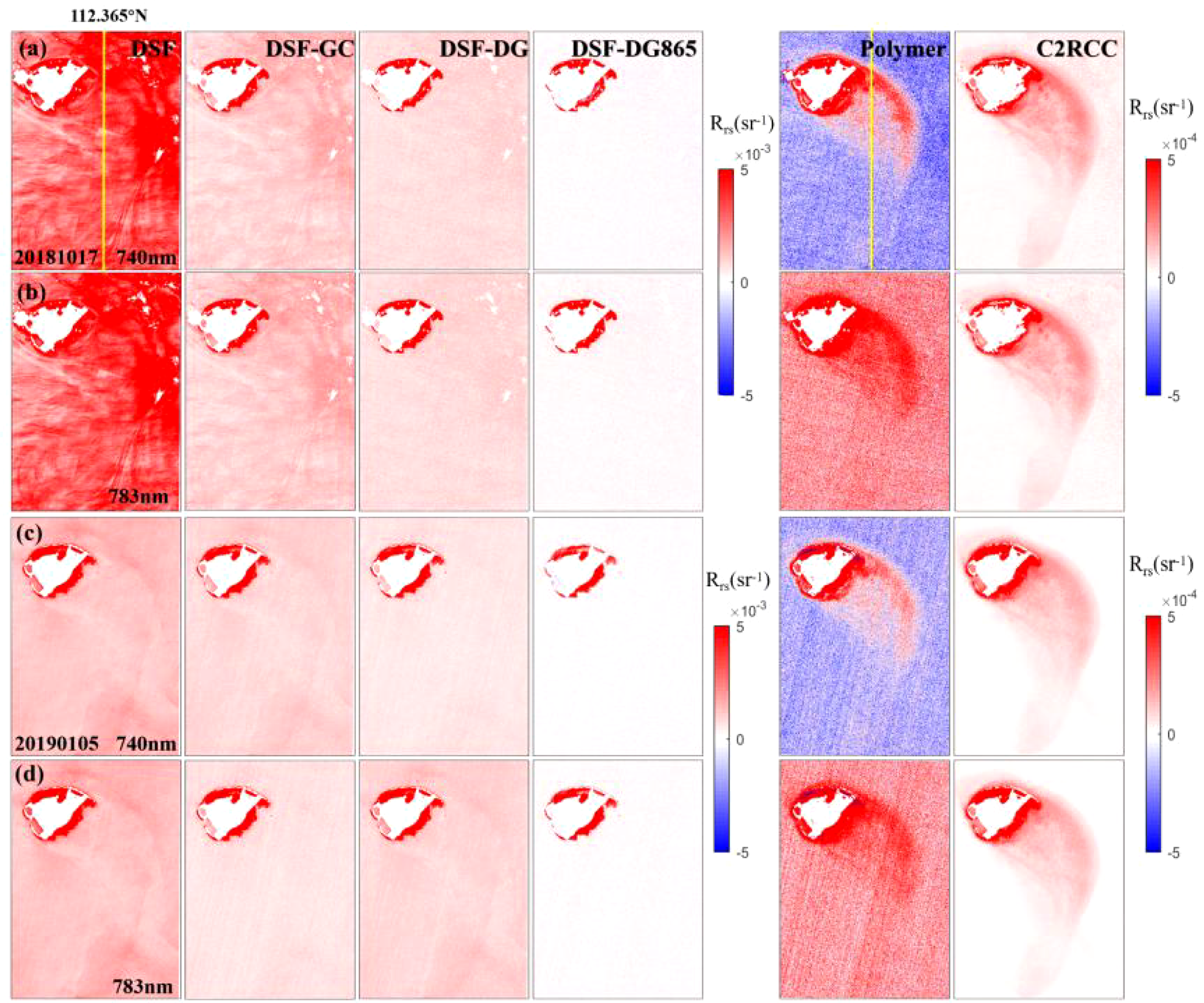 The other glint removal method used in this study is a simplified version of the DG method (DG865), which uses the 865 nm band as the reference band and makes α = 1 and β = 0 in Equation 1: