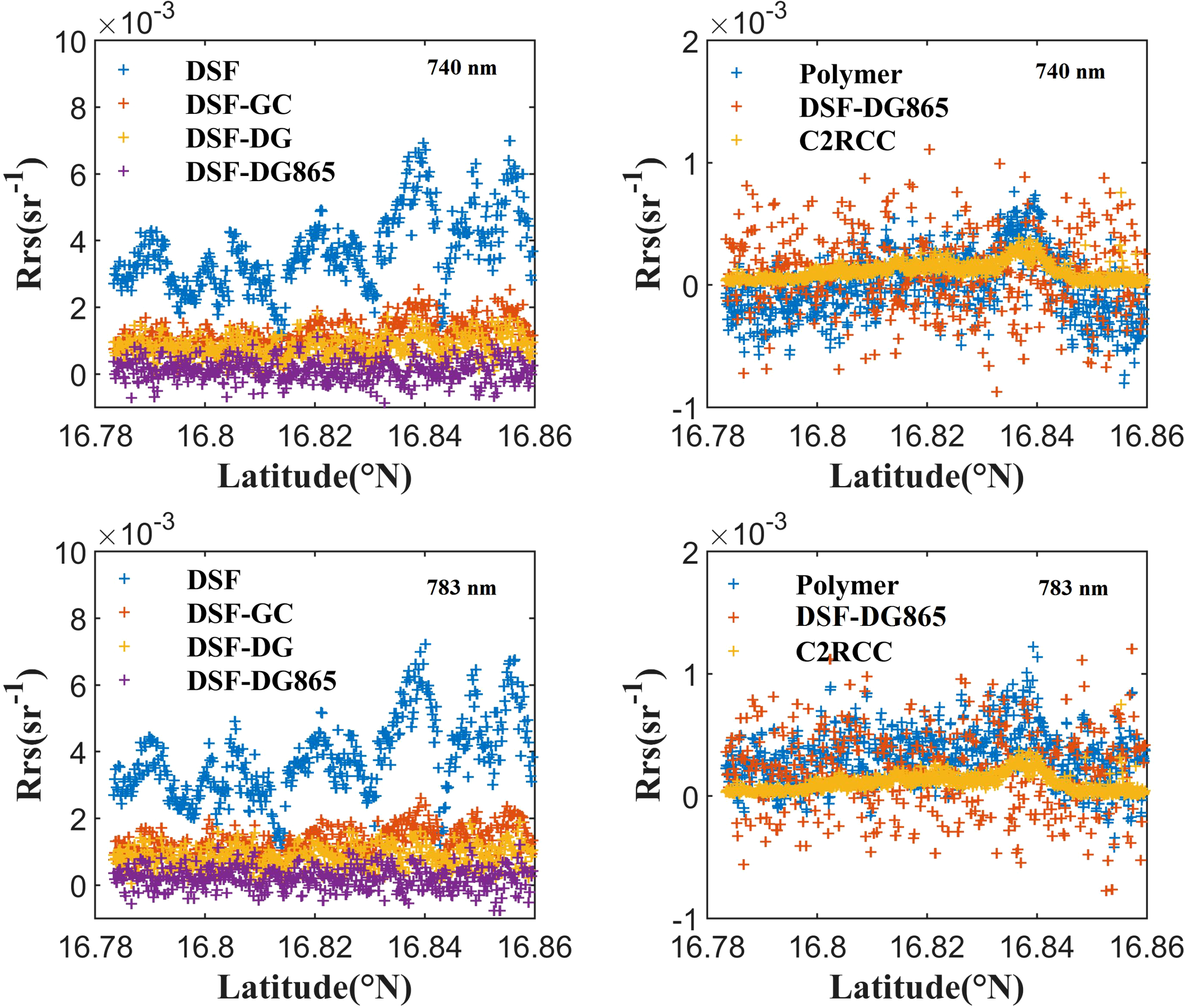 In shallow coral reef waters, Rrs in the near-infrared band may exhibit a non-zero off-water signal despite strong absorption in this band. This phenomenon can be attributed to clearer water and bottom reflections in optically shallow environments, where clearer water allows a relatively high amount of near-infrared radiation to penetrate the water column and reach the seafloor, resulting in a noticeable Rrs signal. However, separating the contribution of bottom reflections from surface glint in optically shallow waters is challenging. Differences in solar altitude due to time differences between in situ spectra and satellite-matched spectra, variations in spectral acquisition angles, and geographic alignment issues further complicate the applicability of assessment methods based on spectral comparisons. It is generally accepted that Rrs in the near-infrared band is close to zero in optically deep waters, and Rrs at 865 nm is often used as the reference band for glint removal and evaluation (Lin et al., 2023). However, in this paper, since Rrs of 865 nm is used in sunglint removal, while the Rrs of the 783 and 740 nm band were used to evaluate the effectiveness of each AC method on surface sunlight scintillation in optically deep waters.