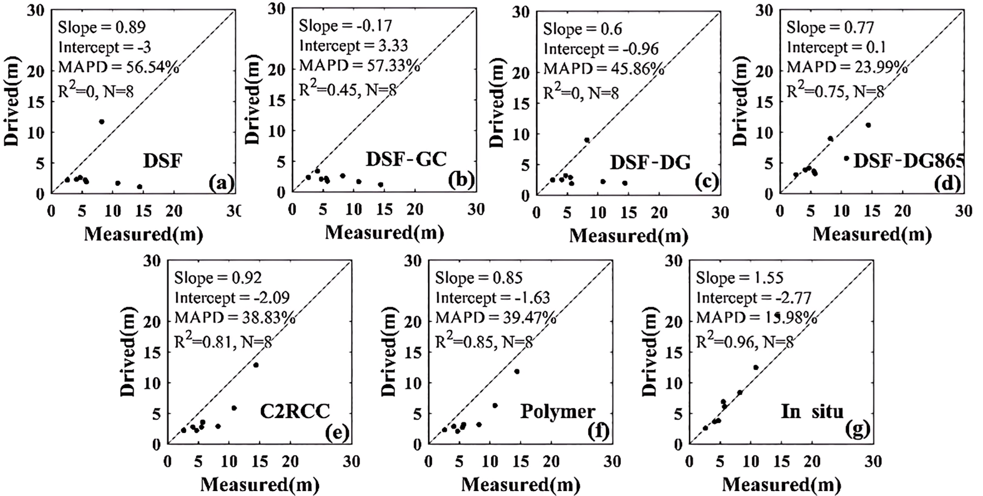 In this study, the statistical parameters used to evaluate the inversion bathymetry include the coefficient of determination (R2), slope, intercept, and Mean Absolute Percentage Difference (MAPD), which is calculated as: