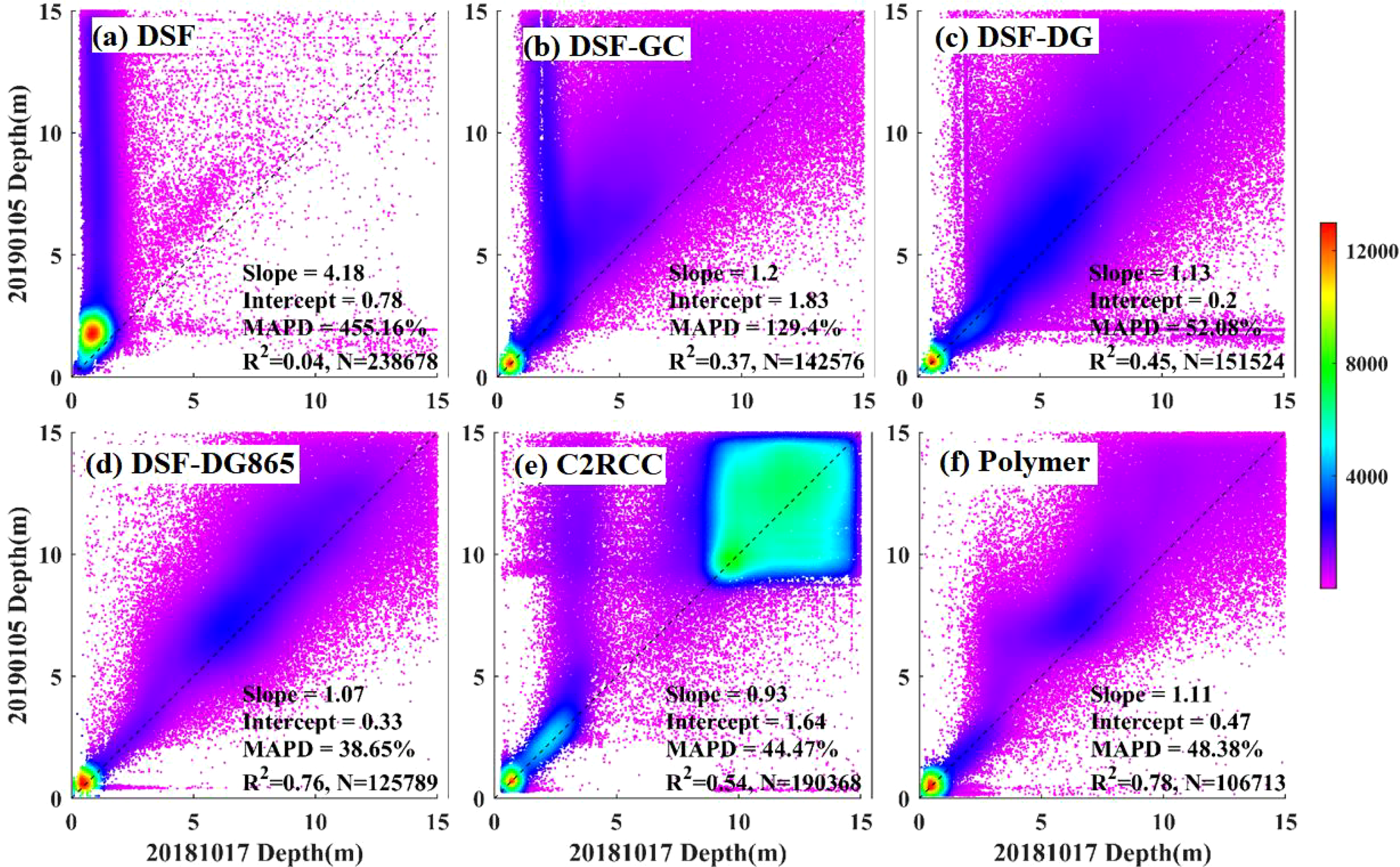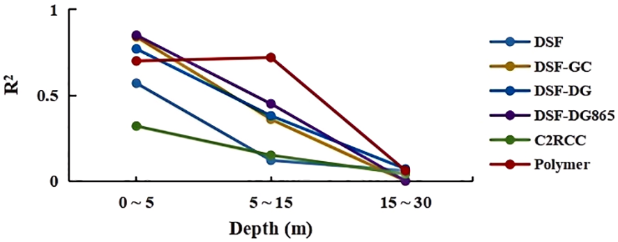While the above AC algorithms are widely used in optically deep waters, their performances in optically shallow coral reef waters is variable. As DSF dynamically identifies the darkest pixels for each band and does not implement adjacency correction, it has been reported to perform worse than other AC algorithms in coral reef waters (Wei et al., 2018; Yan et al., 2023). C2RCC has been shown to underestimate Rrs, likely due to the optical conditions of the training set (Doerffer and Schiller, 2007), raising concerns about its accuracy and stability in shallow coral reef waters (Caballero and Stumpf, 2020). Polymer has been found to underestimate Rrs in turbid coastal waters, where changes in optical properties are not solely dependent on phytoplankton and their appendages (Windle et al., 2022a). Warren et al. (2019) demonstrated that these three algorithms exhibit high uncertainties in optically complex inland and coastal regions of European waters, with R2 less than 0.4, Rrs errors exceeding 100% in the red and 1000% in the near-infrared bands in some cases. Such performance variations raise significant concerns about applying these AC algorithms in the optically shallow waters of coral reefs. While satellite-derived bathymetry (SDB) and inverted substrate types have proven effective in evaluating AC performance in shallow water regions (Goodman et al., 2008; Caballero and Stumpf, 2020; Ma et al., 2020; Caballero and Stumpf, 2021; Duan et al., 2022), the differences in the accuracy of derived SDB and inverted substrate types reflect not only the influence of AC algorthms but also the inherent effectiveness of the algorithms themselves.