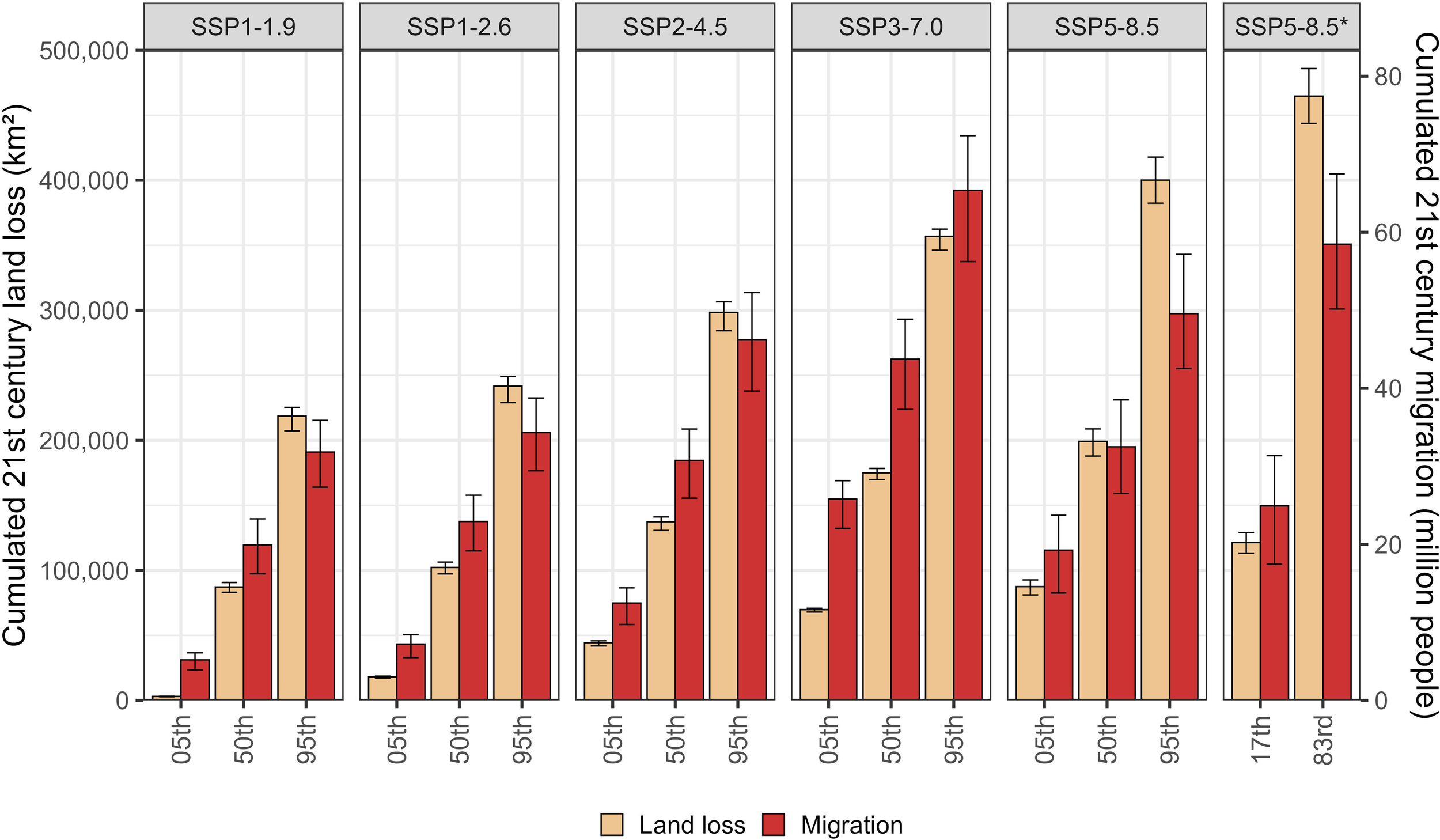 Global cumulative migration (million people, right axis) and net land loss (km2, left axis) over the twenty-first century (2020 to 2100) under different SSP scenarios. Bars represent mean values across all discount rates, with error bars indicating the minimum and maximum values.