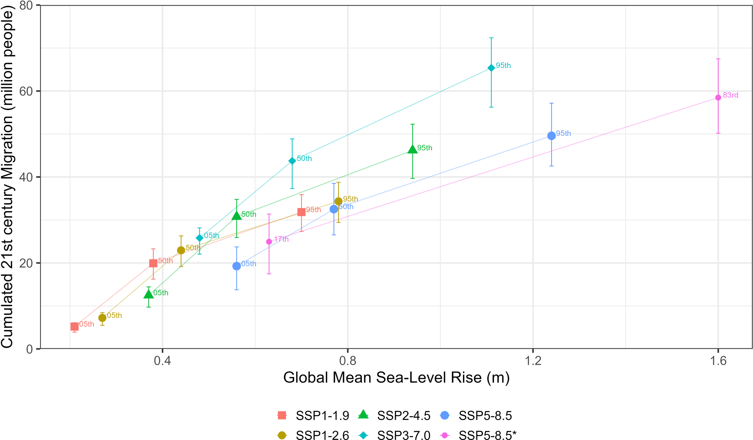 Our results indicate that between 4 million to 72 million people are expected to migrate due to SLR over the twenty-first century across a range of scenarios. The minimum is associated with the 5th percentile of the lowest SLR scenario (SSP1–1.9), and the maximum with the 95th percentile of the SSP3–7.0 scenario (corresponding to a global mean SLR of 0.21 and 1.11 m, respectively, from the baseline period of 1995–2014 to 2100) (Figures 1, 2; Supplementary Table S4). Global migration numbers show a wide range, as they depend not only on SLR scenarios but also on socioeconomic factors, particularly population change. Under the SSP1–1.9 scenario (“sustainability”), a total of 4–36 million people are projected to migrate by 2100. Under the SSP3–7.0 scenario (“regional rivalry”), which represents the highest population growth and lowest economic growth among the SSPs (KC and Lutz, 2017; O’Neill et al., 2017), the migration reaches its highest values, ranging from 22 to 72 million people by 2100. Figure 2 also presents the cumulated number of migrants versus global mean sea levels, highlighting the influence of socioeconomic scenarios on the results, particularly under the SSP3–7.0 scenario. The scenarios with the highest increase in sea levels, represented by SSP5–8.5 95th percentile and SSP5–8.5* 83rd percentile (“fossil fuel-driven”), show a maximum of 57 and 67 million people migrating, respectively (Figure 2).