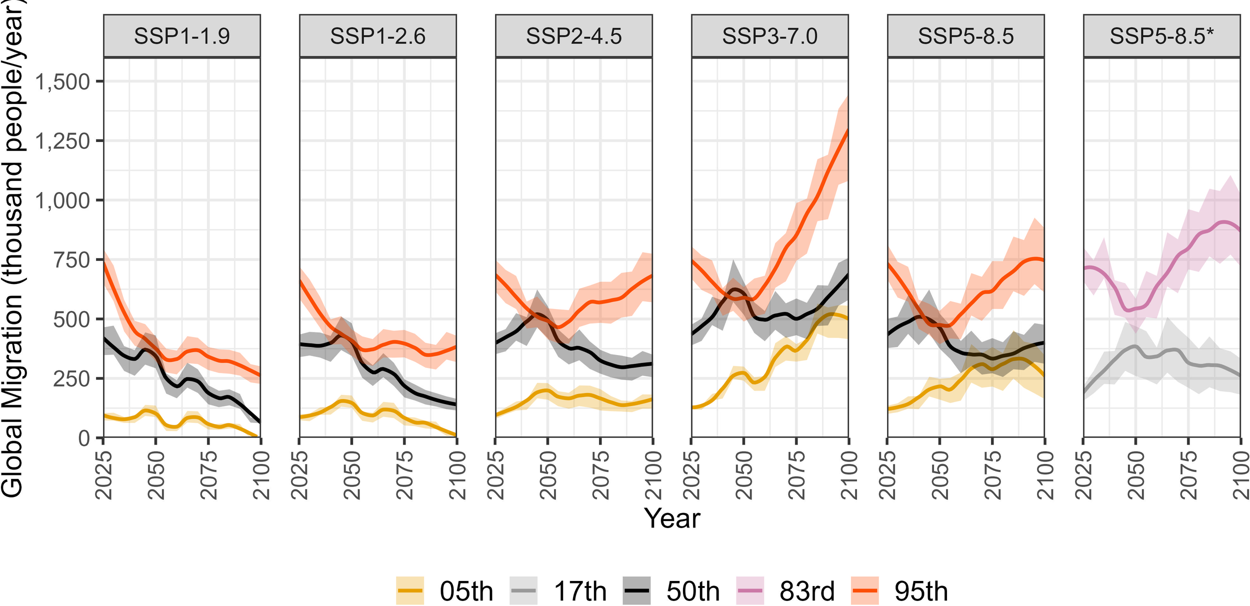 Global migration over time under different SSP scenarios. The line represents the average values, while the shaded area indicates the minimum and maximum values across the three discount rates.
