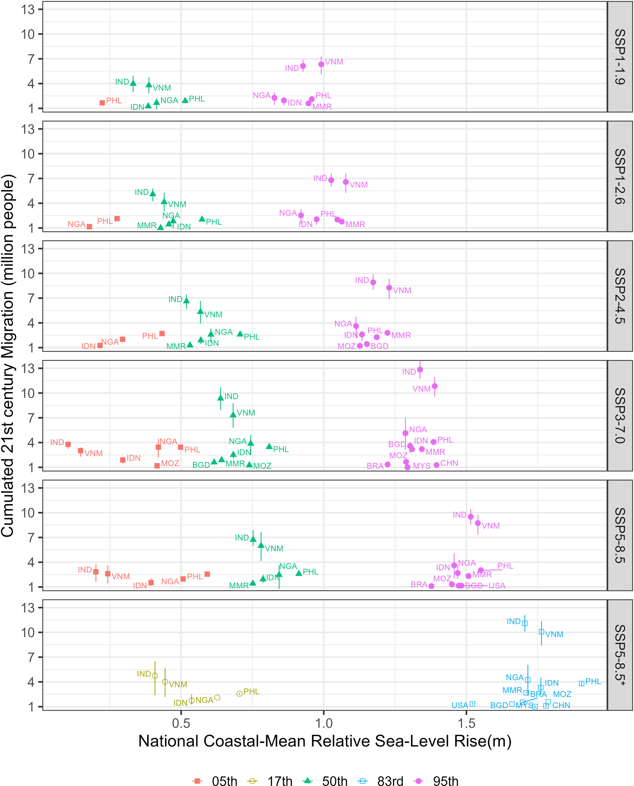 Countries with more than one million people migrating over the twenty-first century (2020 to 2100) under different SSP scenarios in 2100. Sea-level rise is expressed as coastal-mean relative SLR at the country level, as calculated in DIVA. Symbols represent mean values for different percentiles (red/square 5th percentile, green/triangle = 50th percentile, pink/circle = 95th percentile, yellow/hollow circle = 17th percentile, blue/hollow square = 83rd percentile), with error bars indicating the minimum and maximum values across different discount rates. Countries are denoted by their ISO 3166-1 alpha-3 codes: IND, India; VNM, Vietnam; PHL, Philippines; NGA, Nigeria; IDN, Indonesia; MMR, Myanmar; MOZ, Mozambique; CHN, China; USA, United States; BGD, Bangladesh; BRA, Brazil; MYS, Malaysia.