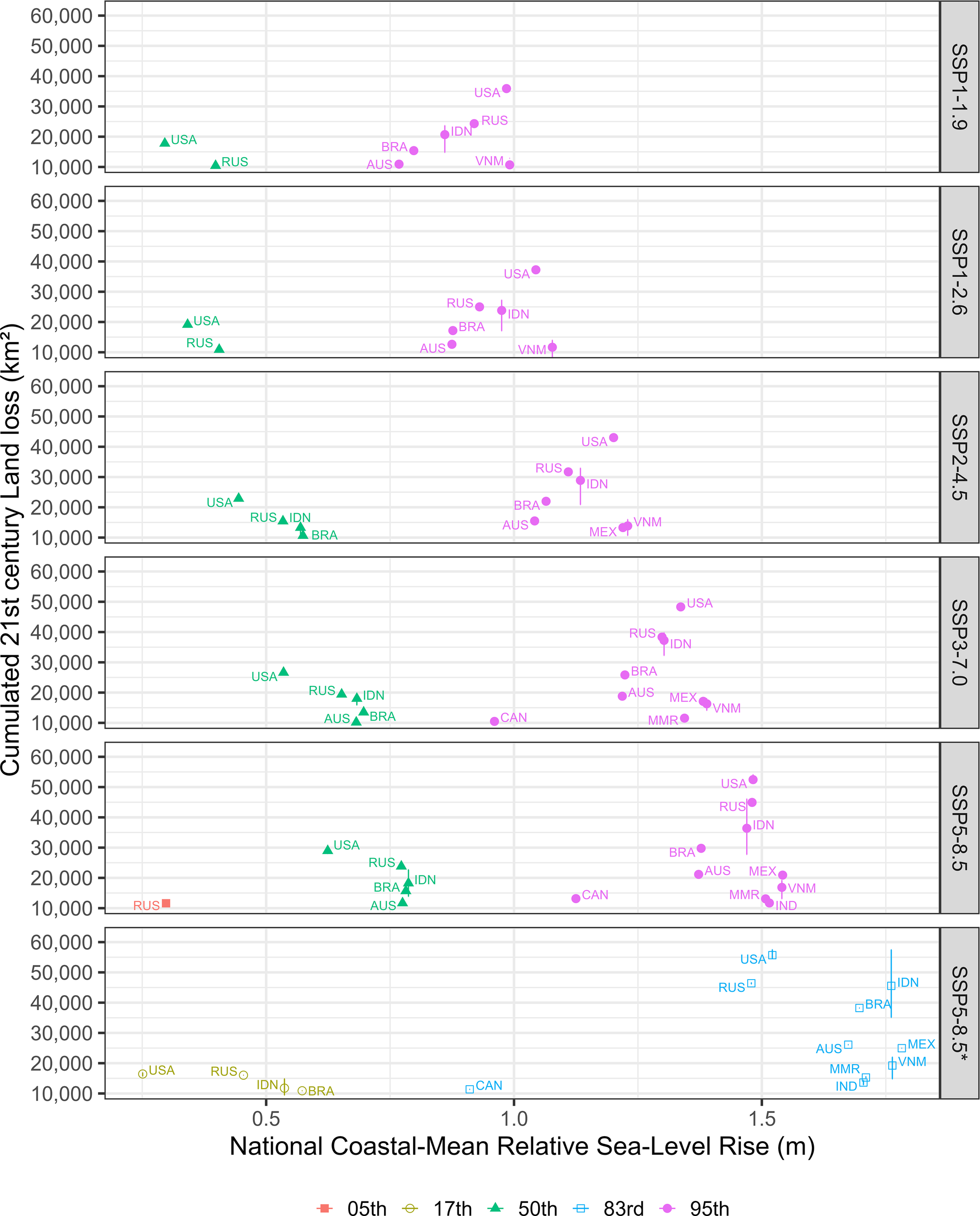 Countries with more than 10,000 km2 of land loss over the twenty-first century (2020 to 2100) under different SSP scenarios in 2100. Sea-level rise is expressed as coastal-mean relative sea level at the country level, as calculated in DIVA. Symbols represent mean values for different percentiles (red/square 5th percentile, green/triangle = 50th percentile, pink/circle = 95th percentile, yellow/hollow circle = 17th percentile, blue/hollow square = 83rd percentile), with error bars indicating the minimum and maximum values across different discount rates. Countries are denoted by their ISO 3166-1 alpha-3 codes: USA, United States; RUS, Russia; IDN, Indonesia; BRA, Brazil; AUS, Australia; VNM, Vietnam; MEX, Mexico; IND, India; MMR, Myanmar; CAN, Canada.