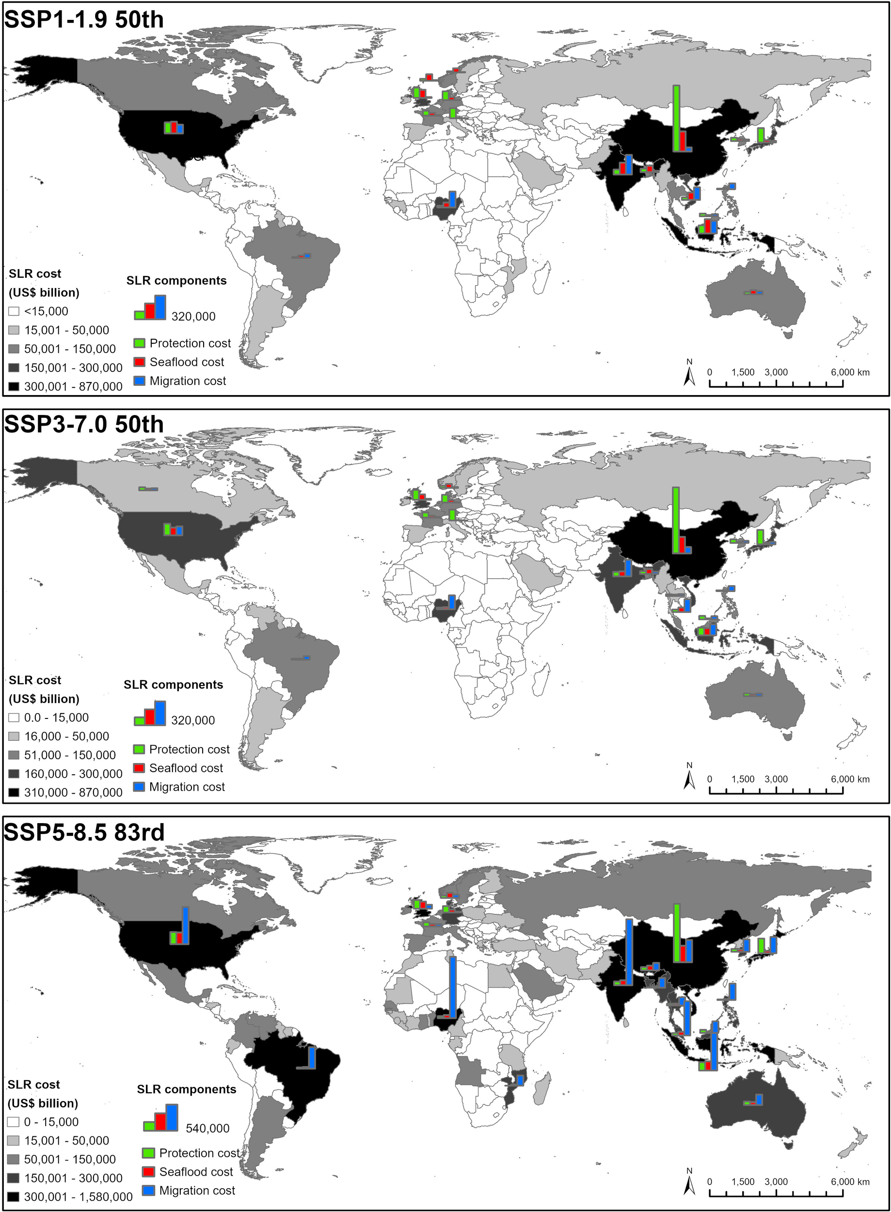 The top 10 countries with the highest total cost of SLR under the SSP1–1.9 50th percentile scenario are China, India, Indonesia, the USA, Vietnam, Nigeria, the UK, Japan, Germany, and Bangladesh (Figure 7). Under the SSP3–7.0 scenario, the highest total SLR costs are observed in China, the USA, India, Indonesia, Vietnam, Japan, Nigeria, the UK, the Netherlands, and Germany. While protection is the predominant component of SLR costs in Europe and some parts of Asia, such as China and Japan—due to high urbanisation and stringent protection standards—migration costs are the most dominant component in southern countries. Under a high-emission scenario (SSP5–8.5* 83rd percentile), the total cost of SLR increases significantly for all countries, with migration costs being particularly high in southern countries and the USA (Figure 7).