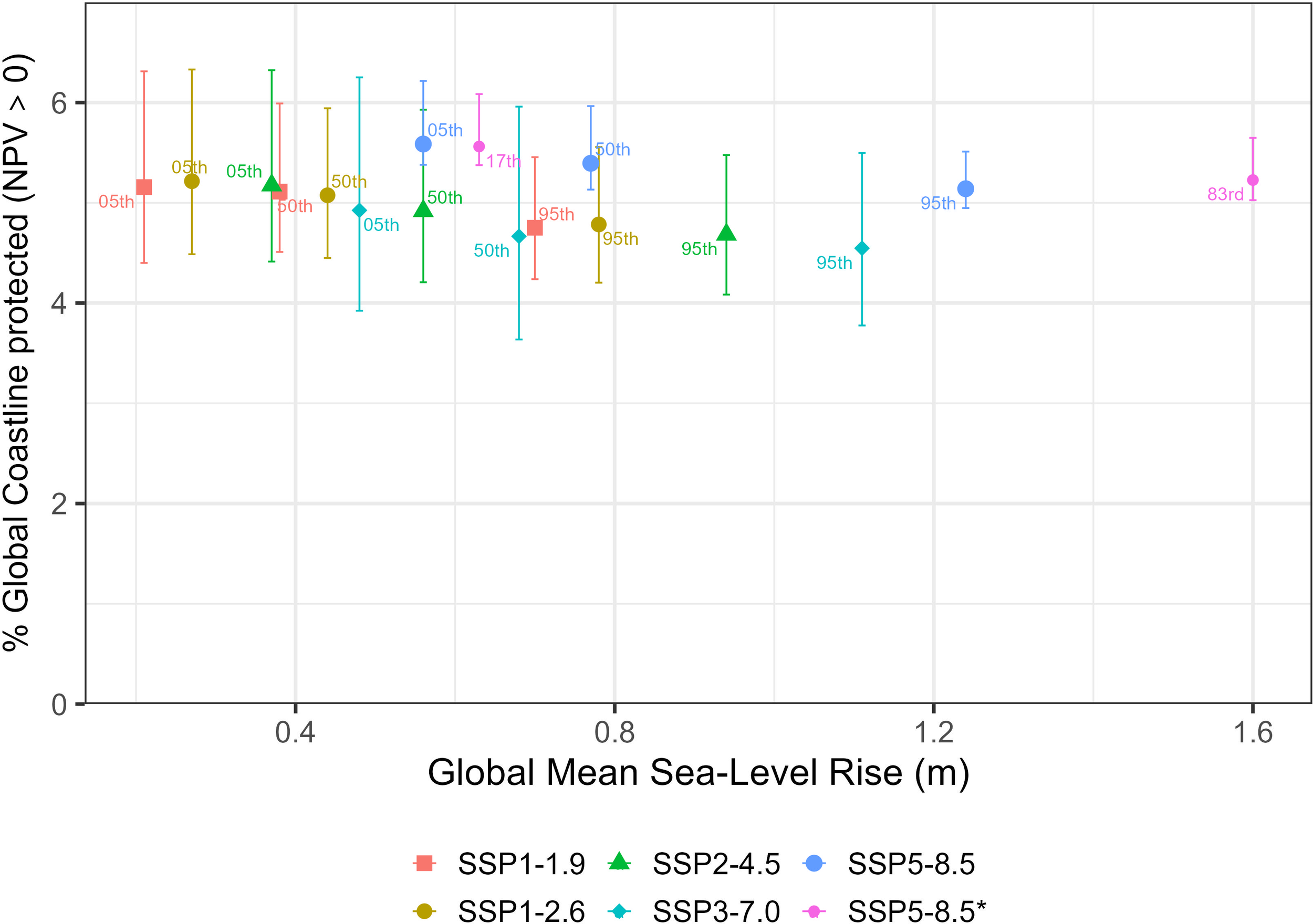 Percentage of the global coastline with robust protection responses (NVP > 0) under different SSP scenarios, shown as mean values considering three discount rates. Error bars represent the minimum and maximum values across different discount rates.