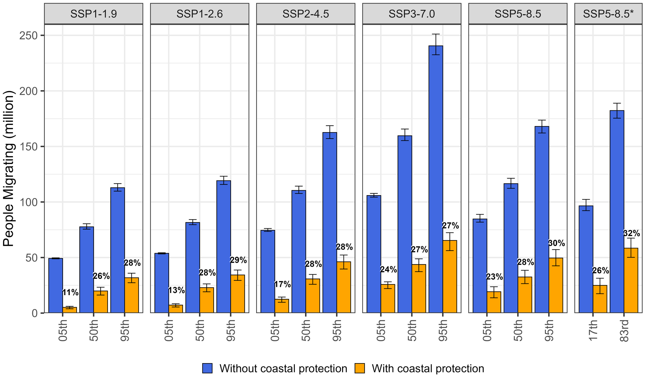 Cumulative number of people migrating under SSP scenarios by 2100, considering cost–benefit-based protection (this study, orange bars) and no protection (maximum migration, blue bars). Numbers indicate the percentage of migrants relative to the total number of potential migrants (without protection).