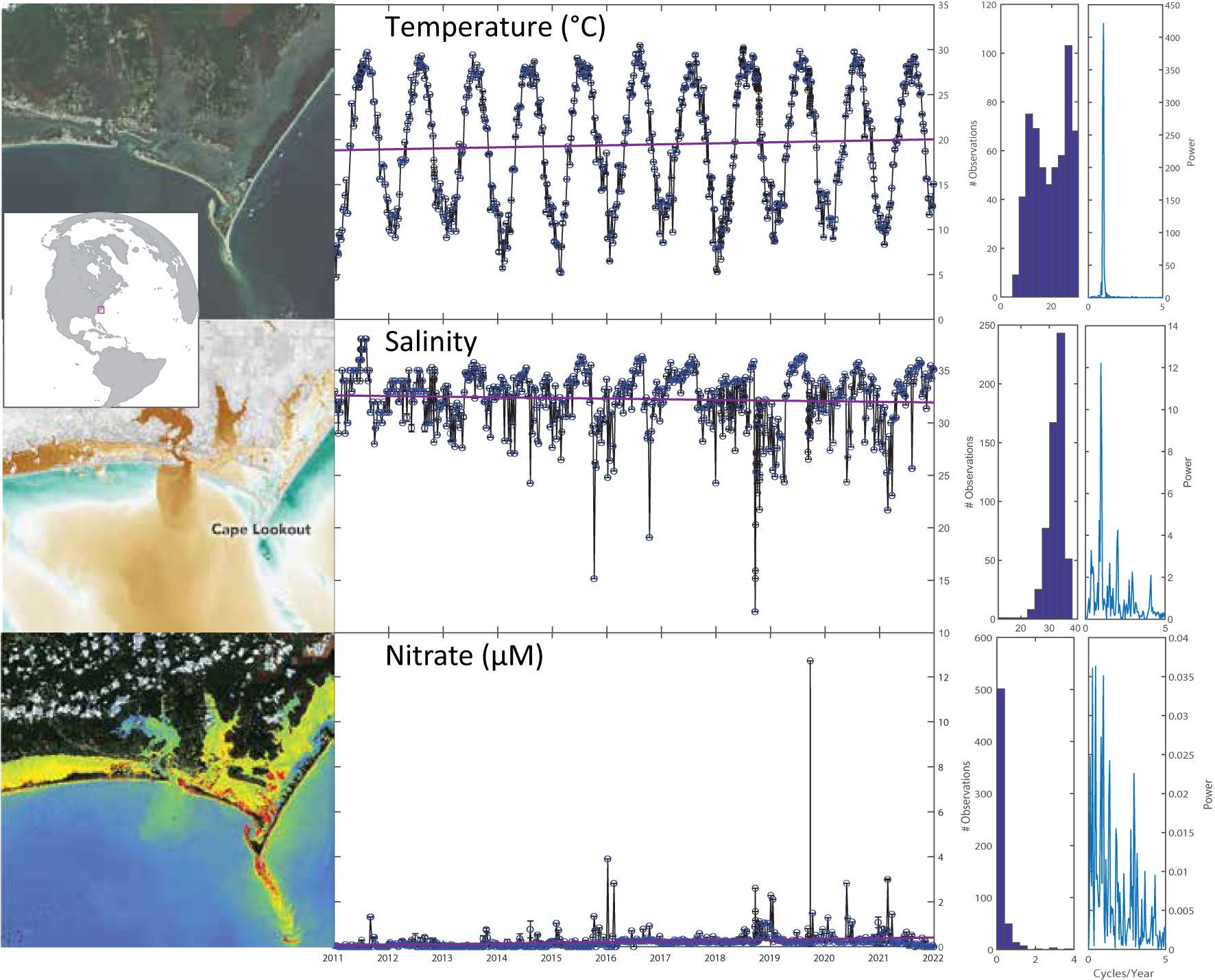 Temporal patterns and trends (red lines) of temperature, salinity and nitrate at the Piver’s Island Coastal Observatory (PICO) study site based on weekly measurements. Right, histogram of observations and frequency spectra demonstrating major differences in the distribution and timing of variability among core biogeochemical variables. Upper picture: Sentinel-2 highlight optimized natural color image remote sensing image centered on PICO site from 20240827. Center picture: false color image of dissolved organic matter concentration satellite product following a major storm (after Jordon 2018/NASA). Bottom picture: false color image of chlorophyll concentration from Sentinel-2 Se2WaQ processing from 20240901.