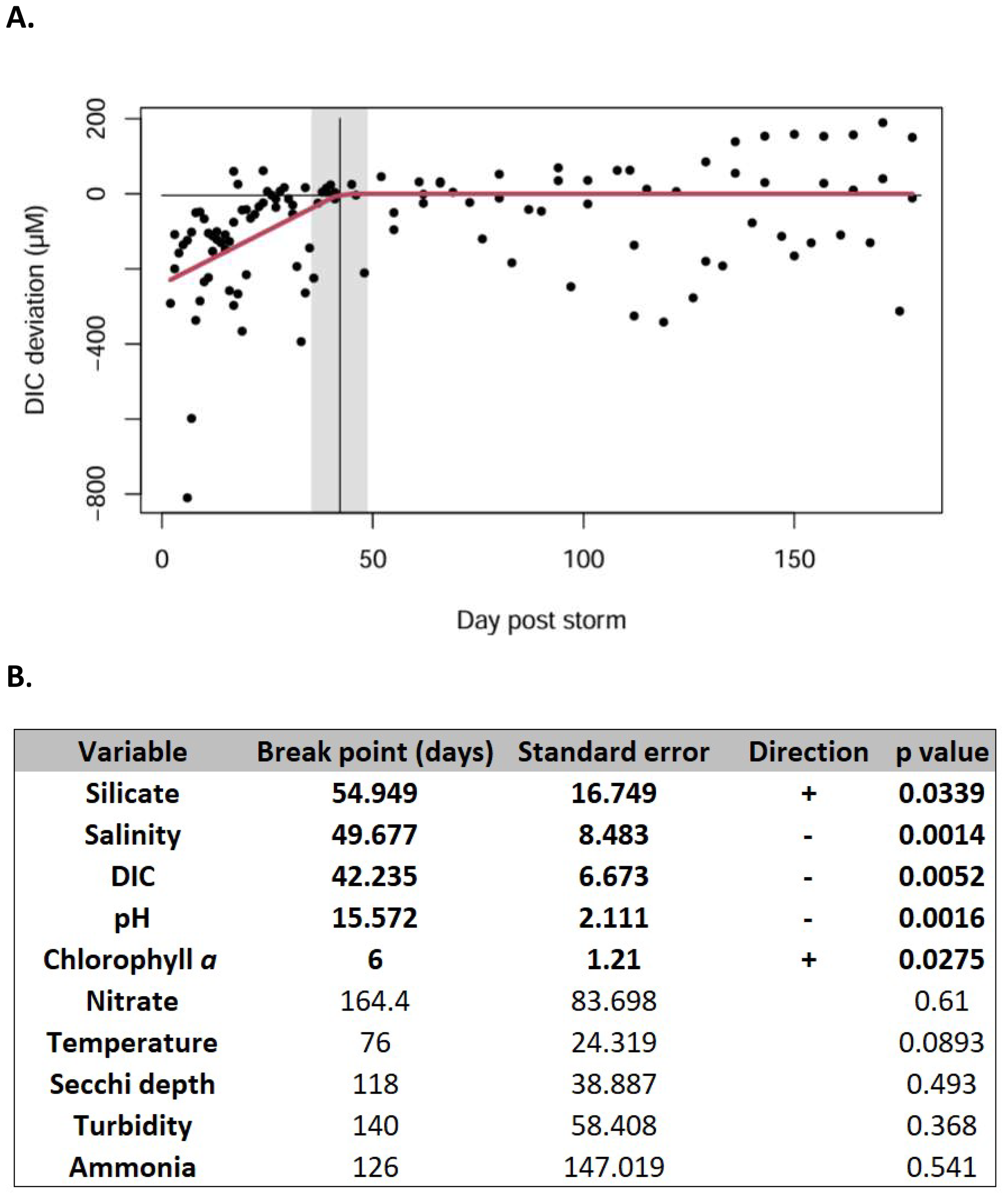 Time scale of environmental variable responses to wet tropical cyclones. (A) Panel showing post-storm deviation of environmental variable Dissolved Organic Carbon (DIC) from predicted seasonal norm for up to 180 days following three wet tropical cyclones that impacted the study site Irene (2011), Florence (2018) and Dorian (2019). Red line tracks the deviation from seasonally-expected values, the vertical black line indicates the predicted break point (days) with the shaded region showing the standard error (B) Table summarizing break point analysis for a suite of environmental factors. Bold rows indicate statistically-significant deviations from seasonal environmental conditions. Direction indicates whether the environmental factor is higher or lower than the expected seasonal condition.