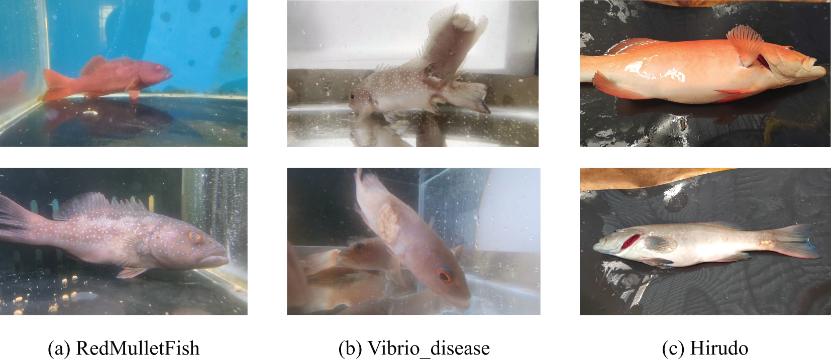 The dataset used in this study was meticulously curated to facilitate comprehensive research on diseases affecting Plectropomus leopardus. Images were collected from various aquaculture facilities specializing in the breeding of Plectropomus leopardus. The collection process focused on capturing both healthy specimens and those exhibiting symptoms of common diseases, such as Vibrio disease and Hirudo parasitic disease, as shown in Figure 1. The dataset includes a total of 1,041 images, classified into three categories: healthy Plectropomus leopardus, Hirudo parasitic disease, and Vibrio disease. Each image was meticulously annotated by experienced veterinarians and marine biologists to ensure accurate documentation of the disease status.