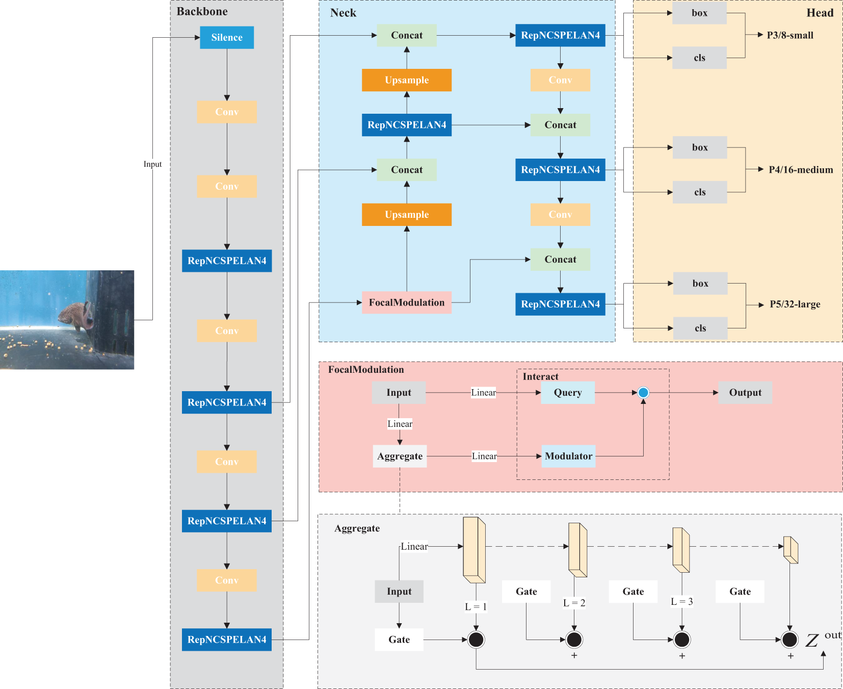 Recent advancements in object detection have introduced various techniques to optimize both the accuracy and speed of deep learning models Wu et al. (2020). FocalModulation is one such innovation designed to improve feature extraction across multiple spatial scales. It has been widely applied to enhance model performance, particularly in tasks requiring the identification of small or subtle features Yang et al. (2022). FocalModulation allows the model to focus more on the critical regions of an image, which is crucial for detecting small disease markers in Plectropomus leopardus, such as the attachment sites in Hirudo parasitic disease and early lesions in Vibrio disease.