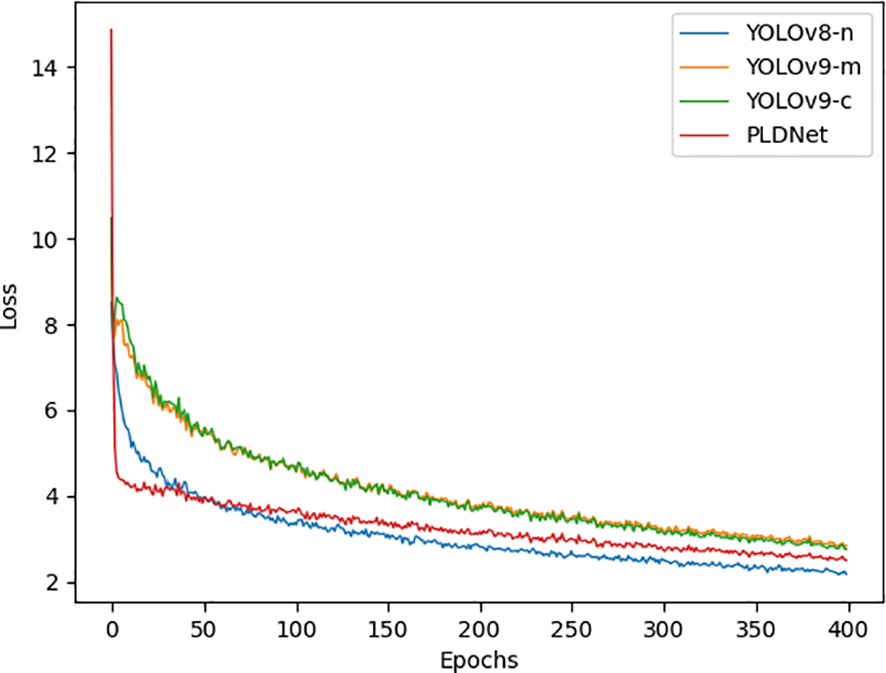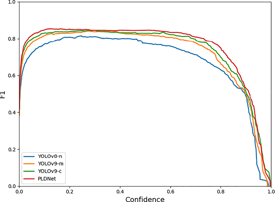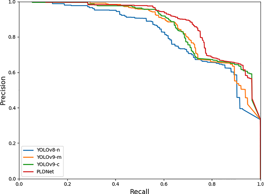We implemented the YOLOv8-n, YOLOv9-m, and YOLOv9-c models and compared them against our proposed PLDNet. Our method outperforms the other object detection approaches in both accuracy and speed on the same dataset.
