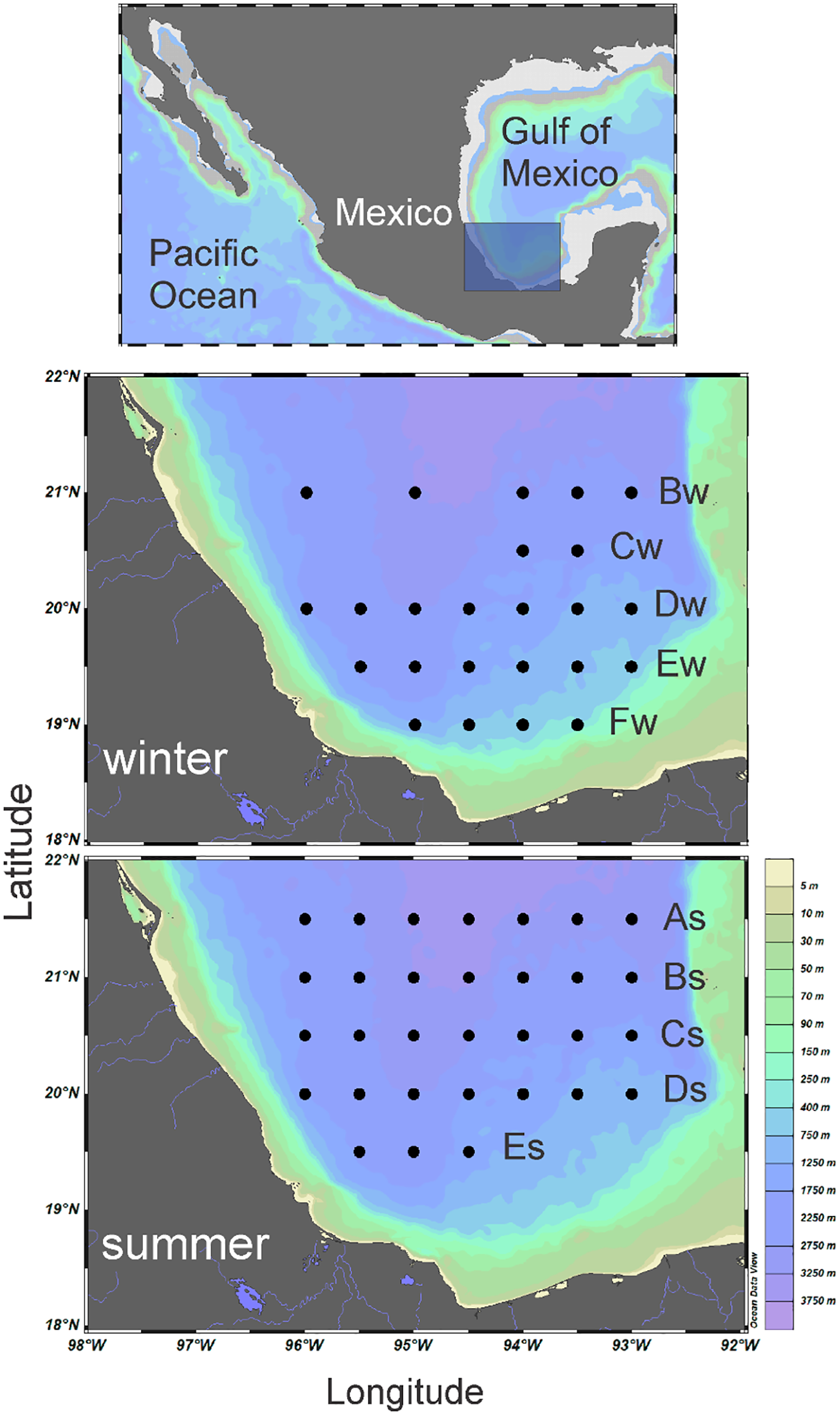 Zooplankton sampling was carried out in the oceanic province of the southern Gulf of Mexico aboard the R/V “Justo Sierra” in two contrasting seasons, winter 2013 (24 oceanographic stations from January 25 to February 3) and summer 2014 (31stations from June 4 to 14) (Figure 1; Supplementary Table S1). At each station, temperature and salinity were recorded before the zooplankton sampling with a CTD sonde (Sea-Bird SBE 9) from the surface to 1000 m depth. Zooplankton samples were obtained using a stratified cylinder-conical zooplankton multinet system (nylon, 75 cm mouth, 2 m length, and 500 µm mesh size); this system consisted of a Double -Trip Mechanism (General Oceanics 1000-DT), whose purpose is the opening and closure of plankton nets. At each oceanographic station, samples were obtained at five depth levels of the water column: 0–200 m; 200–400 m; 400–600 m; 600–800 m; and 800–1000 m, depending on bottom depth. Sampling was performed for approximately 25 minutes following double oblique tows at a speed of approximately 3 knots; each net was equipped with a standard mechanical flowmeter (General Oceanics 2030R) to calculate the filtered water. The oceanographic stations were arranged in five longitudinal transects for each season (transects Bw to Fw in winter, and As to Es in summer), but their latitudinal positions slightly differed (Figure 1). The time of day (day/night) at which each sampling was carried out was recorded. A total of 255 samples were obtained from which 104 were taken in winter and 151 in summer. Zooplankton samples were fixed in a 4% formalin-seawater solution and, posteriorly, preserved in 70% ethanol because of the objectives of the project, concerning one, the study of fish larvae growth throughout the analysis of otoliths, which are best preserved in alcohol (Campana, 1989).