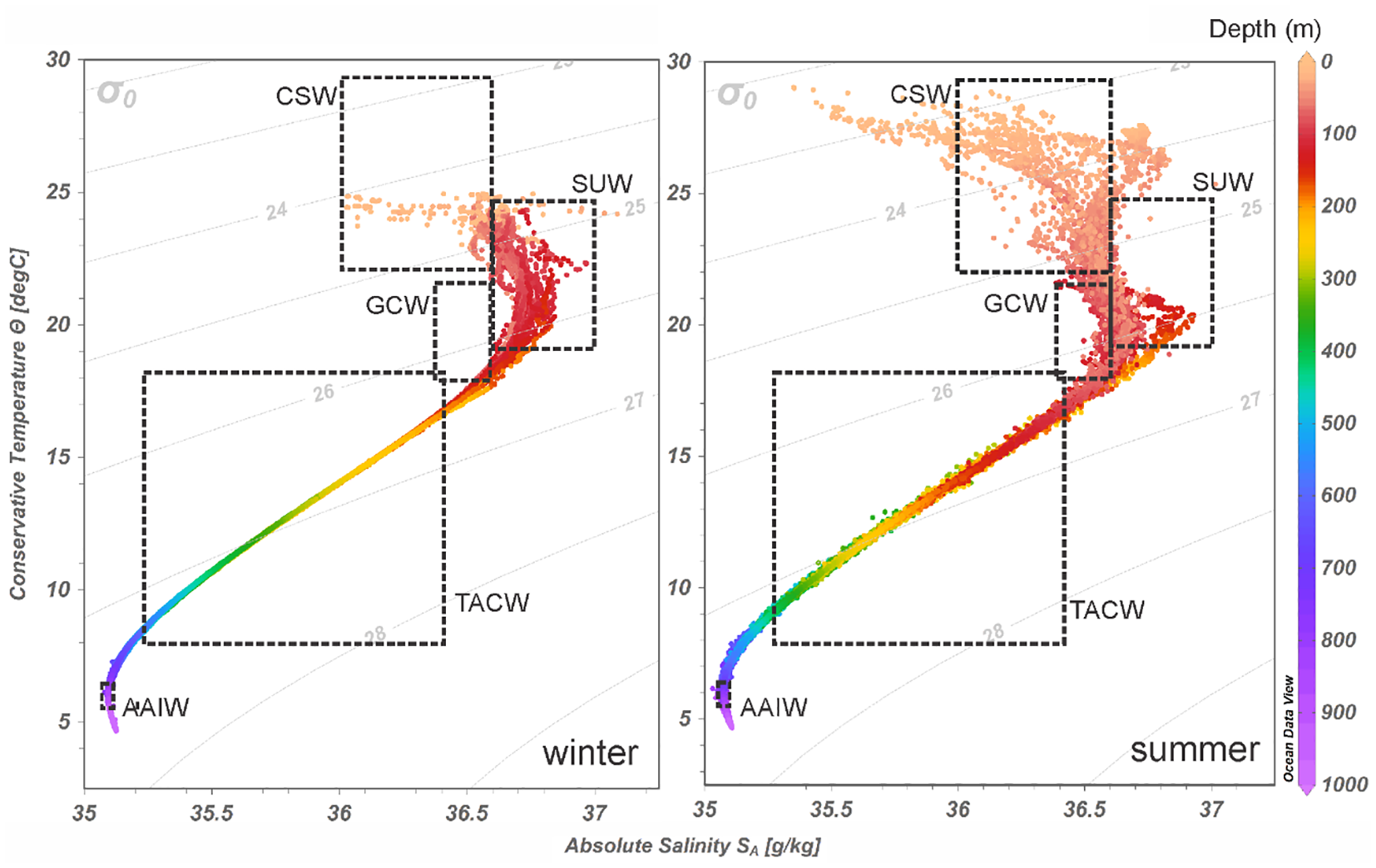 Conservative temperature (θ) – absolute salinity (SA) diagrams of data from the oceanic province sampled during winter and summer in the southern Gulf of Mexico. Water masses: Caribbean Surface Water (CSW), North Atlantic Subtropical Underwater (SUW), Gulf Common Water (GCW), Tropical Atlantic Central Water (TACW), and Antarctic Intermediate Water (AAIW).