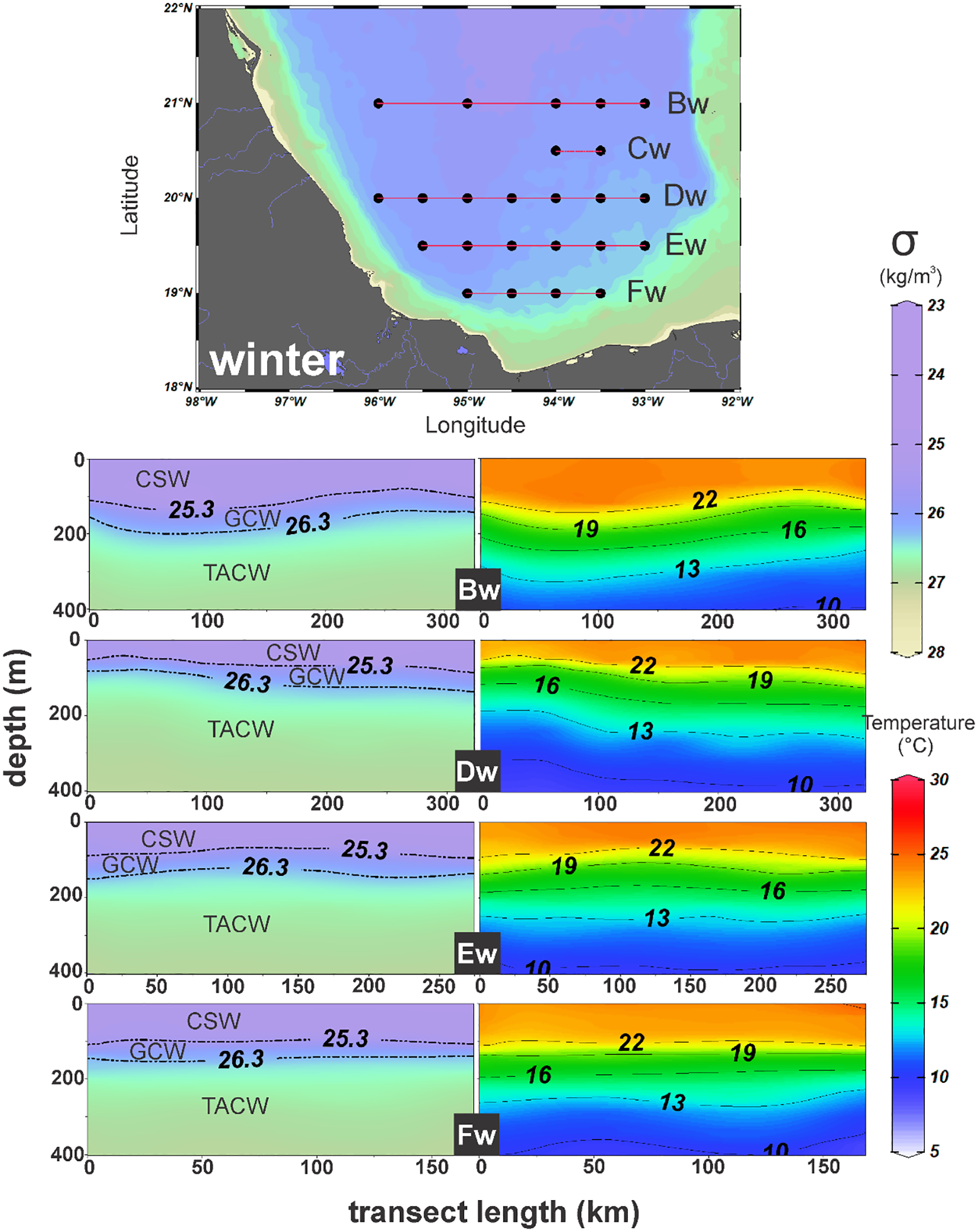 Vertical distribution of the water density (kg/m3) and potential temperature (°C) in the southern Gulf of Mexico during winter 2013. Water masses abbreviations are in Figure 2 caption.