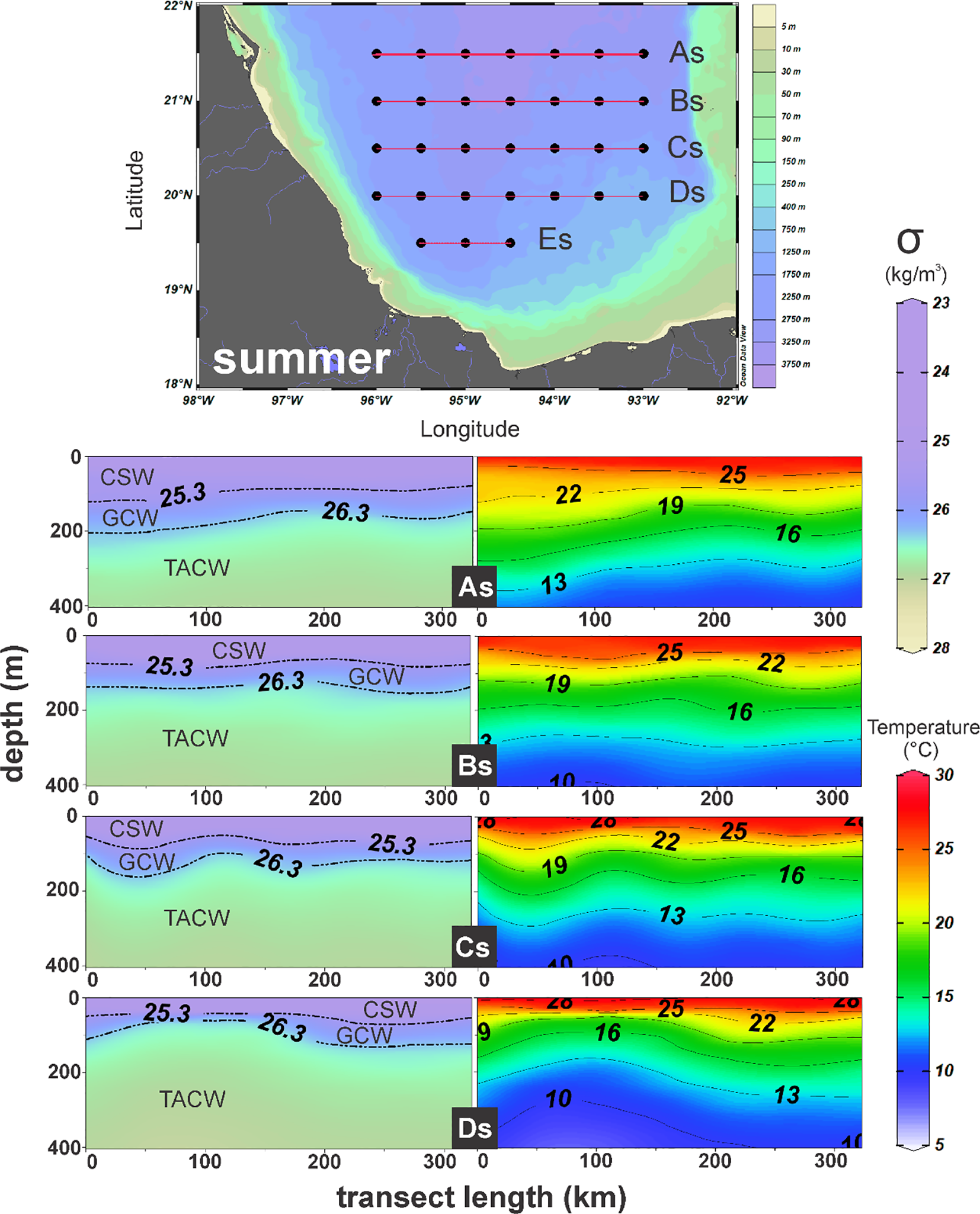 Vertical distribution of the water density (kg/m3) and potential temperature (°C) in the southern Gulf of Mexico during summer 2014. Water masses abbreviations are in Figure 2 caption.